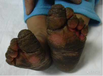 患儿,男,1岁半,因双手、足、肛周角化性斑块1年3个月。患儿出生后双手足指(趾)甲呈淡白色,出生100天后父母发现其掌跖部发生黑褐色或褐色丘疹和皮肤增厚性斑块,肛周有类似损害。损害进行性加重,掌跖部出现疣状肥厚性斑块,患儿行走和抓物困难,走路和抓东西时容易哭闹。肛周皮损面积逐渐扩大,指(趾)甲颜色更白,口周出现红斑,粗糙,头发稀少。患儿饮食、睡眠正常,足月顺产,父母非近亲结婚,家族中无类似发病者。