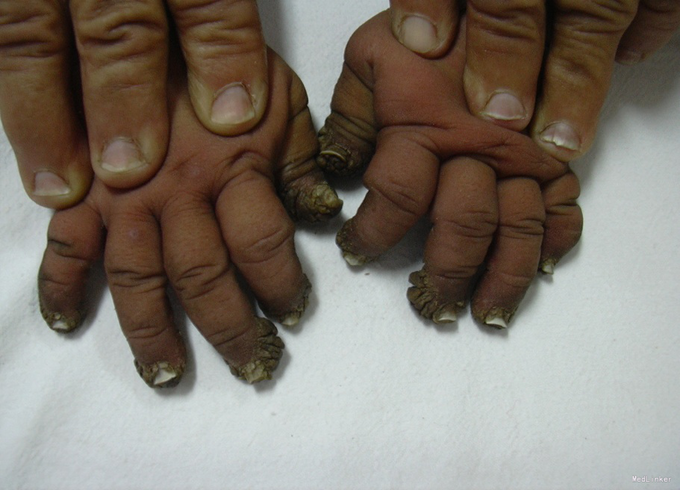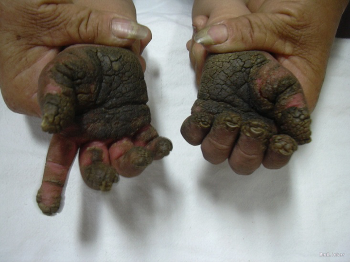 Olmsted综合征是一种罕见的先天性掌跖角皮症,由Olmsted于1927年首先报道。该综合征大多数为散发病例,仅有四篇报道为家族性聚集发病,其遗传方式不清楚,常染色体显性或X-连显性或X-连隐性均有提及,但在Rivers等报道的一家系中,三代患病,其中患病的父亲传到儿子,在Yaghoobi等报道的一家系中也是父亲传给儿子,在这两个家系中可以排除X-连隐性遗传,而且强烈提示常染色显性遗传。 有的学者指出像其他遗传性皮肤病,如可变性红斑角化病一样,Olmsted综合征可能存在不止一种遗传方式。本综合征的病程呈慢性进行性,掌跖部位皮损组织病理学检查无诊断意义,确立诊断主要依赖于临床特征。掌跖对称性的角皮症和腔口部位对称性的角化过度是诊断Olmsted综合征的两个主要特征。鉴别诊断包括其他掌跖角皮症综合征:mal de Meleda、先天性厚甲症、Papilon-Lefevre综合征、Clouston综合征、Vohwinkel综合征、肠病性肢端皮炎等。本病目前无满意的治疗方法。局部治疗包括:湿敷、水杨酸、尿酸、硼酸、矿物油、润肤剂、维A酸、糖皮质激素、抗生素、较长时间浸泡水中等,但只能暂时缓解。个别报道用维A酸霜和5%水杨酸不但无效反而加重。甲氨蝶呤、系统使用糖皮质激素不能控制皮损。系统使用维A酸似乎是最有效的方法,有的作者取得了比较好的效果,有些却无效。