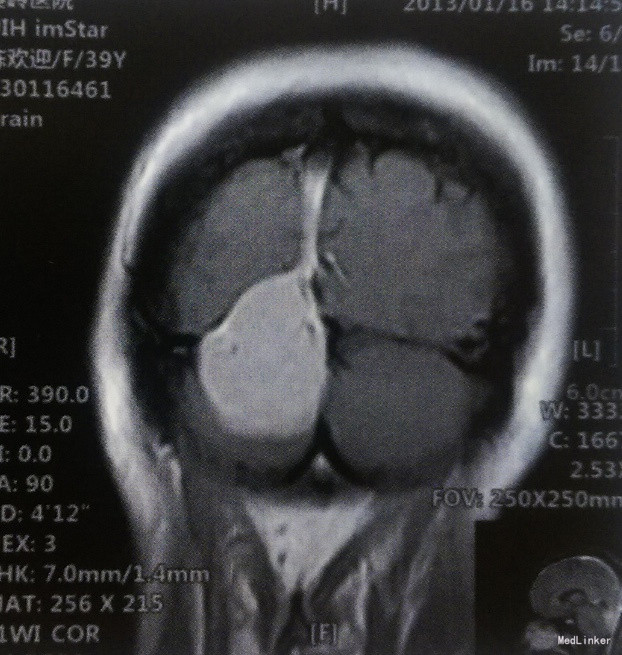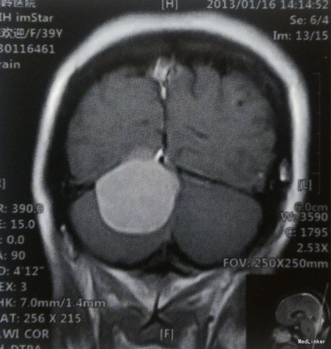 患者,女,39岁,已婚。主因间断头痛、头晕1年,加重1个月入院。 患者于1年前无诱因偶发头痛,以左颞部为著,呈钝痛,伴头晕,夜间休息时明显,打喷嚏时加重,自行口服“止痛药”效果不佳。1个月前上述症状加重,双颞侧头部闷痛明显,前往当地医院就诊,行头颅MRI检查:小脑幕下右侧小脑半球后方占位性病变,考虑脑膜瘤。未行任何治疗,门诊以“右侧小脑幕脑膜瘤”收入我科。既往体健,无其他相关病史。