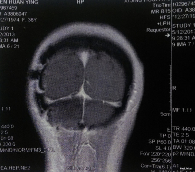 体格检查:神经系统查体未见明显阳性体征。 术前影像学检查 头颅MRI检查:肿瘤边界清楚,T1WI呈等信号,T2WI为略高信号,信号均匀,病灶呈宽基底,与小脑幕及颅骨内板相连,增强扫描均匀强化,可见,“脑膜尾征”。