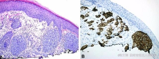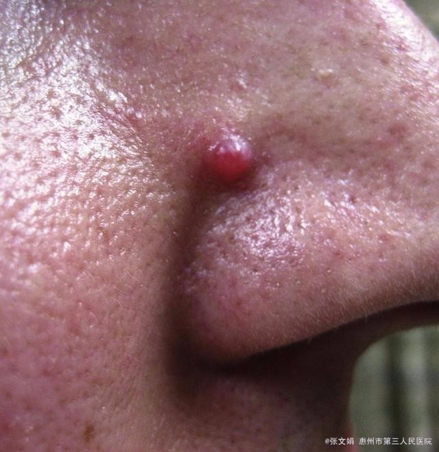 患者男,34 岁,有气管鳞癌骨转移病史,他入选临床试验,接受抗 PD-L1 免疫疗法。 6 个月前,患者右鼻唇沟新出现了一处不断增大的皮损(见图 1),查体见 3 mm 大粉红色圆顶丘疹伴毛细血管扩张,实施了刮取活检。