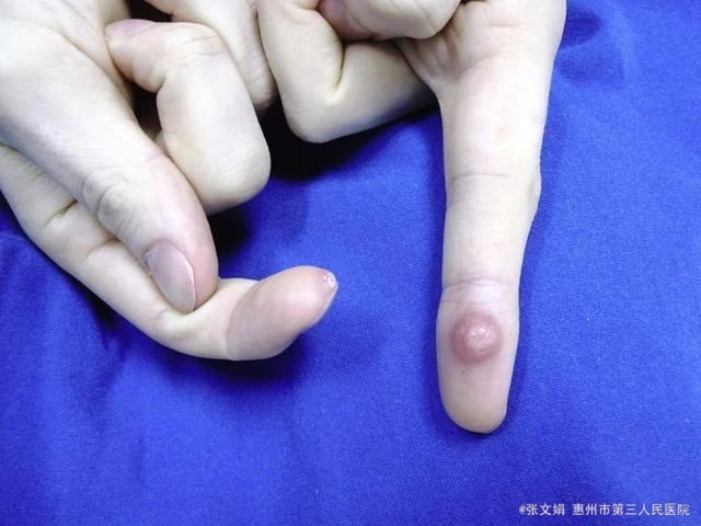 组织病理学示表皮基本正常,真皮内岛屿状上皮样细胞增殖(见图 2A)。这些细胞有明显的多形性、核深染、大量异型有丝分裂、细胞核拥挤,正常皮肤结构被取代。还显示大量淋巴细胞浸润(对恶性肿瘤的免疫反应)和血管扩张。 免疫组化染色示细胞角蛋白 5/6 和 7 阳性(图 2B),细胞角蛋白 20 和甲状腺转录因子 1 阴性。这些组织病理学和免疫组化结果符合转移性鳞癌。 患者活检部位的皮损复发,手指也出现了相似形态的新发损害,放疗均有效果(图 3)。该患者继续接受免疫治疗,所有部位的病变均保持稳定 8 个月,此后出现恶化。