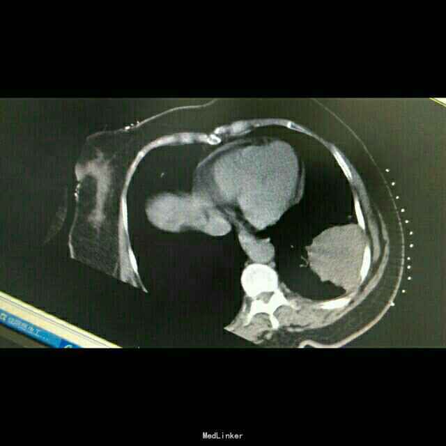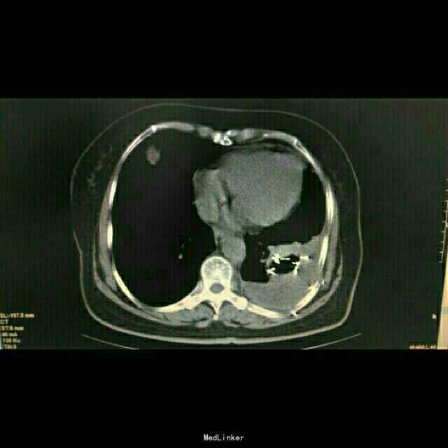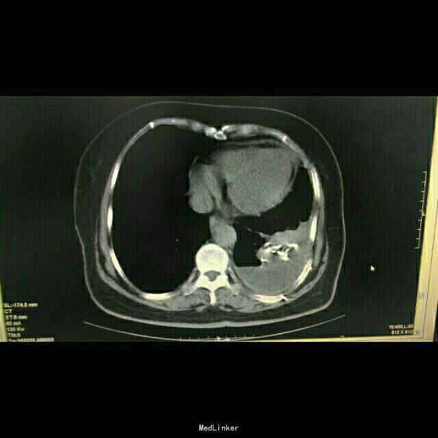 主 诉:咳嗽伴胸闷半年余,痰中带血1月余。 现病史:患者于半年前无诱因出现干咳伴胸前区不适,未重视,于10月2日出现痰中带血就诊于市人民医院行胸部X片示:不除外双肺占位,进一步行胸部CT示:左肺下叶CA,双肺多发转移,左支气管旁淋巴结肿大。口服云南白药治疗后痰中带血症状消除。为求诊疗就诊于我院,门诊以:“左肺占位性病变、双肺转移”收住我科。患者自发病以来,精神饮食尚可,体重无明显减轻。 既往史:既往2型糖尿病病史10余年,口服格列吡秦控制,血糖控制不理想,冠心病病史10余年,平素口服复方丹参片控制。