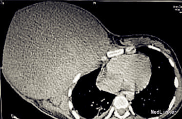 查体:生命体征平稳,患者右乳巨大肿块,长径约30 cm;皮肤水肿、微红,皮下血管怒张;肿块外下方因肿瘤溃破出血已用碘方纱填压止血。 辅查:胸CT提示右第3、4前肋骨皮质不连续,考虑肿瘤侵犯,右胸少量积液。穿刺活检考虑恶性叶状肿瘤。