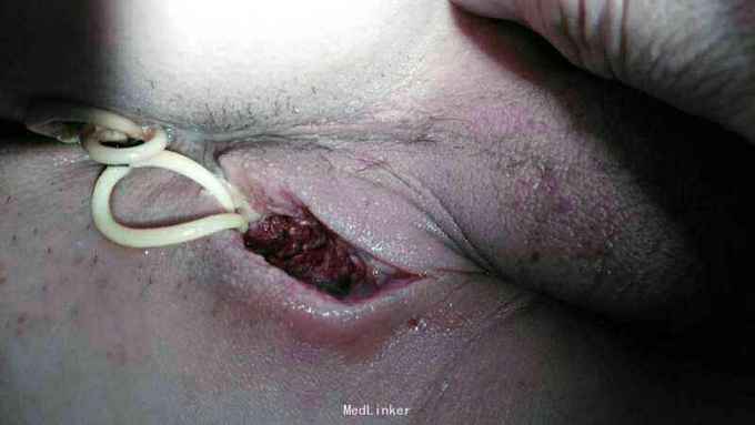 复杂性肛瘘肛周脓肿 入院后在腰麻下在阴囊左侧肿块远端切开脓腔探针进入探查发现通到5点位折返通向直肠内,在转折处切开皮肤皮下组织与探针汇合,造出新外口,探针在手指引导下探查到直肠内8cm上找到内口,搔刮窦道后行橡皮筋紧线挂线术,外口清创后留中间皮桥行挂虚橡皮筋引流,美兰长效止痛,油纱布填塞。