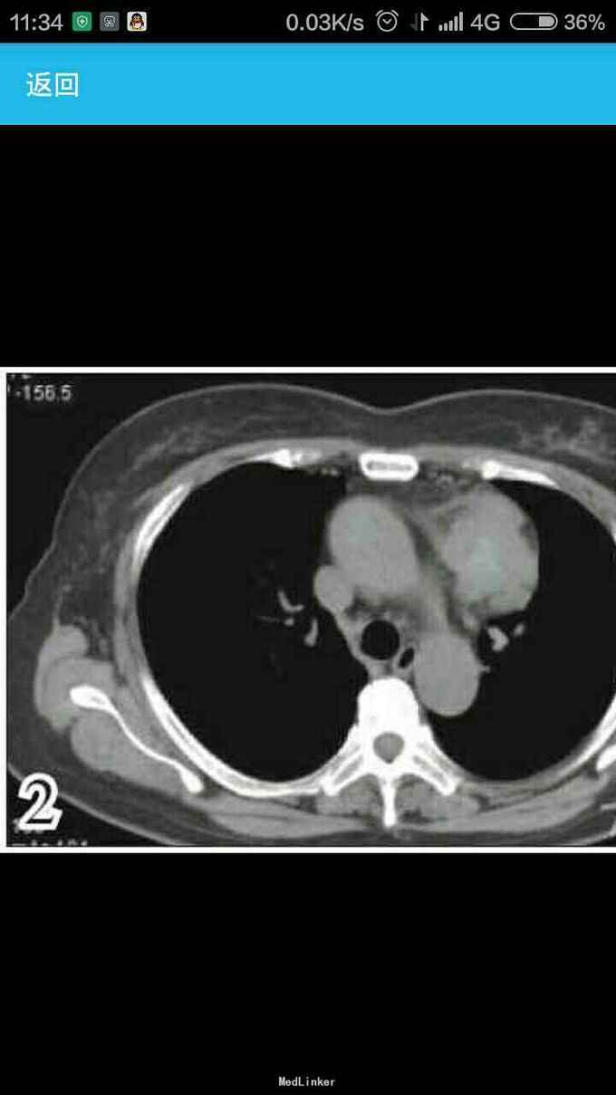 女性,60岁,因左 趾关节红肿、剧痛,红肿弥漫足背 23天来诊,不伴发热,无外伤史, 全身体检无明显异常。 胸片示,左侧前上纵隔占位性病变(图1)。胸部CT示,左侧前上纵隔内见5.7 cm×3.8 cm软组织肿块影,内见斑片状稍高密度影,境界不清(图2——5)。 实验室检查显示,血尿酸517.1 μmol/L(正常值180——357 μmol/L),临床诊断为“急性痛风”,为排除相关疾病作进一步检查。 印象:左侧前上纵隔占位(恶性肿瘤?畸胎瘤?)。 手术结果:肿瘤位于左前纵隔,大小约为8 cm×8 cm ×6 cm,质硬,表面光滑,与心包、无名静脉、肺门粘连(侵犯壁层、脏层、胸膜、肺门、心包、膈肌、膈神经,伴肿大淋巴结)。【病理结果示】(图6):肿块9 cm×6 cm×4 cm,侵犯周围脂肪组织,伴神经内分泌分化。肿块标记:CD5(+)、CD117(+)、嗜铬粒蛋白A(CgA)灶(+)、突触素(Syn,+)、CD56 (-)、细胞增殖因子Ki-67约20%(+)。【诊断】胸腺鳞状细胞癌Ⅱ——Ⅲ级,伴神经内分泌分化。