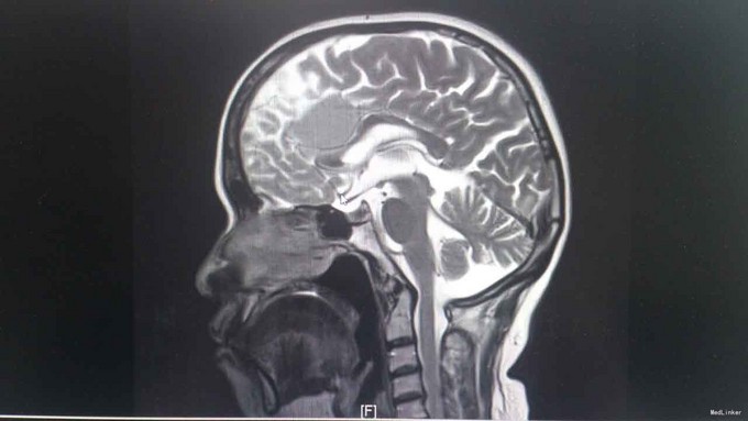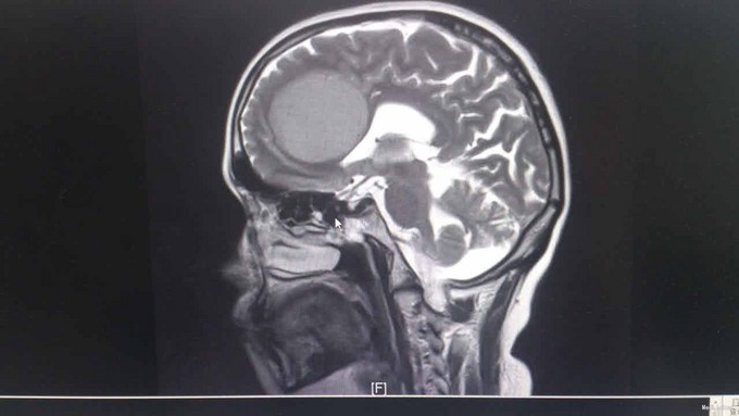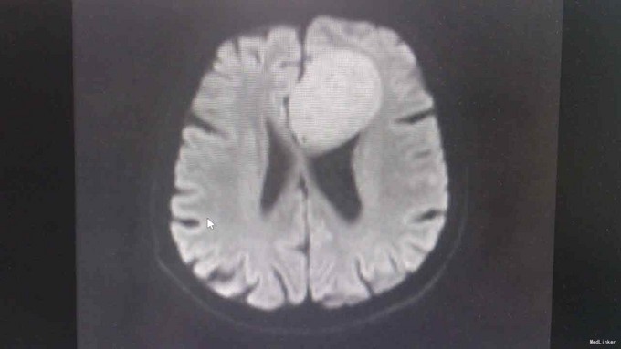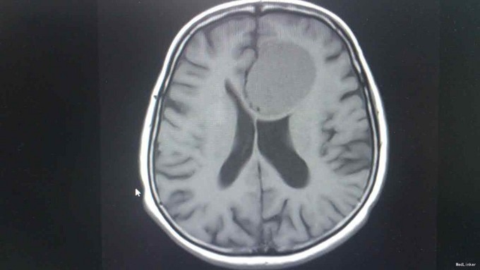 T:37℃,R: 20次/分,P:84次/分,BP:122/88mmHg。发育正常,营养中等,自主体位,步态平稳,表情自如,神志清楚,对答切题,查体合作。皮肤粘膜未见苍白、黄染,未见皮疹,无皮下出血点,无伤口。全身浅表淋巴结未扪及肿大。头颅无畸形。眉毛无脱落,眼睑无水肿、下垂、倒睫,睑结膜无苍白、充血,球结膜无充血、水肿,巩膜无黄染,角膜透明,眼球活动灵活,无凸出、凹陷、震颤、运动障碍,双侧瞳孔等大等圆,直径约3mm,对光反射灵敏,集合反射正常,左眼不能正常闭合。耳廓正常,无畸形,鼻部外形无异常,口唇红润,口腔粘膜未见出血点及溃疡,伸舌左偏,咽部无充血,扁桃体无肿大。颈软,无抵抗,颈静脉无充盈,肝颈静脉回流征(-),气管居中,甲状腺不大。胸廓对称无畸形、无局部膨隆或凹陷。呼吸平稳,节律规则。双侧呼吸动度对称。双肺部叩诊清音。双肺呼吸音清,未闻及干湿性啰音。心界不大,心率84次/分,律齐,各瓣膜区未闻及病理性杂音。腹平软,未及压痛,未及反跳痛,腹部未扪及包块,肝右肋下、剑突下未及,脾未触及,胆囊未触及,Murphy征(-)。移动性浊音阴性,肠鸣音正常,约4次/分。脊柱四肢无异常。生理反射存在,病理反射未引出。 专科检查:计算力、定向力、记忆力正常,双侧瞳孔等大等圆,直径约 4mm,对光反射灵敏,辐辏反射正常,眼球运动无受限,左侧眼睛不能正常闭合,左侧额纹消失,左侧鼻唇沟变浅,伸舌左偏,鼓腮无漏气,双上肢肌力5级,双下肢肌力5级,生理反射存在,病理反射未引出。 相关检查:血常规、大便常规、肝功能、凝血四项、离子四项、心肌酶、血脂四项、肾功能、肿瘤二项未见明显异常。 头颅增强MR1.左侧额叶大脑镰旁见团块状异常信号影,考虑脑膜瘤;2.双侧辐射冠区缺血灶;3.轻度脑萎缩。 肝胆脾胰B超、泌尿系B超未见异常。胸片示:1.双肺纹理稍增多、增粗,请结合临床;2.右上纵隔增宽,建议必要时CT检查。