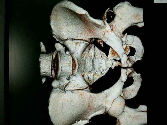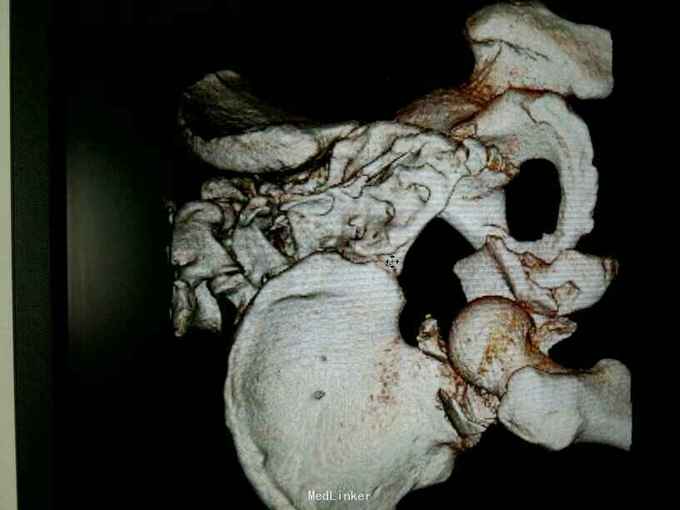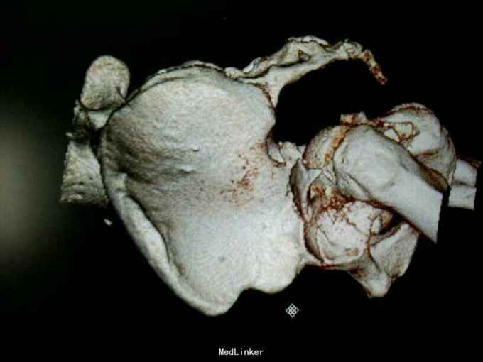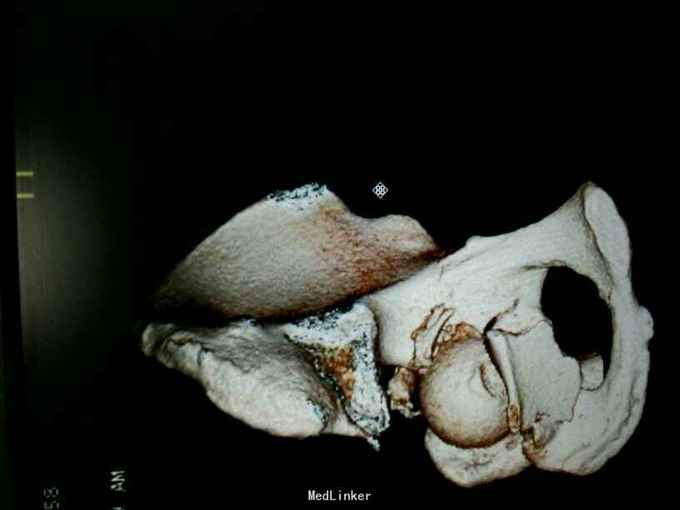 专科情况:患者平车推入病房,左股骨髁上骨牵引中,左髋部压痛、叩击痛(+),左髋关节主动活动受限,被动活动可引起明显疼痛,骨盆挤压、分离试验(-),脊柱、余肢体无畸形及压痛、叩击痛,关节无红肿、活动自如。双侧膝、跟腱反射正常,双侧Babinski征阴性。 辅助检查:骨盆三维重建CT示:左侧髋臼及耻骨下支骨质不连续,见多发不规则形骨折线,骨折断端错位成角,可见多发游离骨片,股骨头向后移位,其周软组织肿胀。