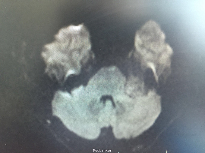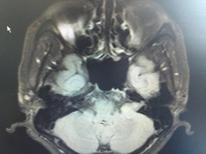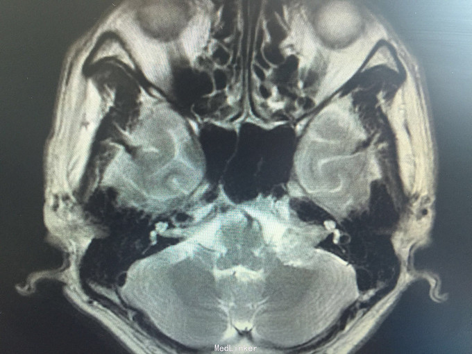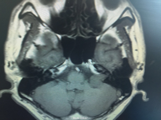 查体:BP:150/90mmHg,心肺腹未见异常,神清语明,左耳听力丧失,无面瘫,双瞳孔等大正圆,直径约3.0mm,光敏,四肢肌力5级,肌张力正常,巴氏征R-L-。