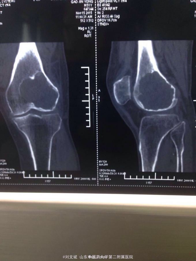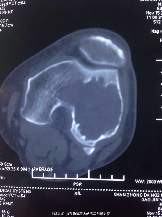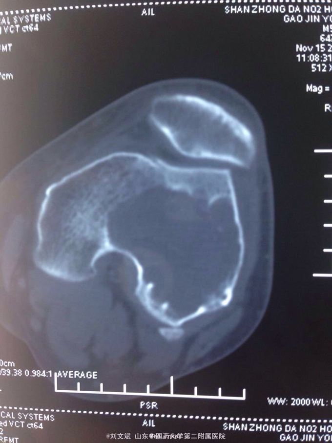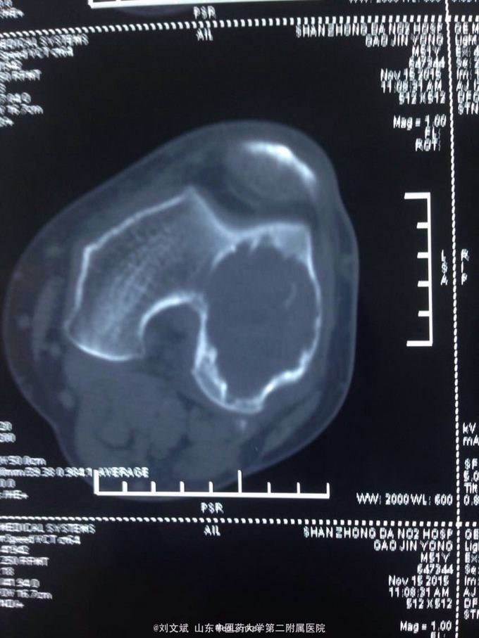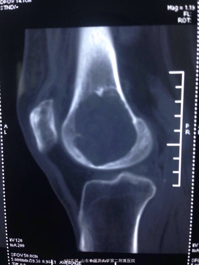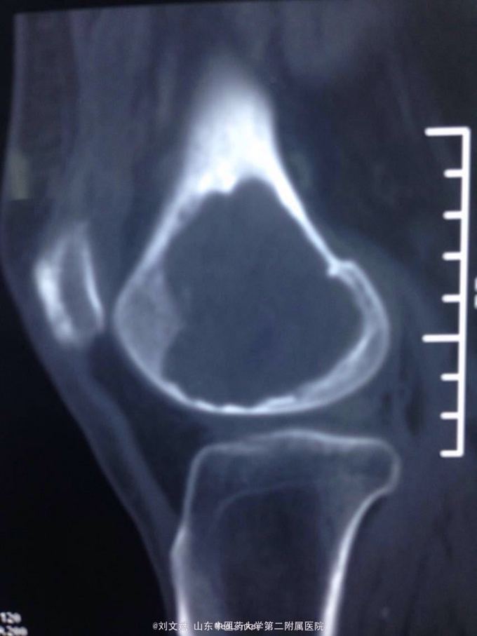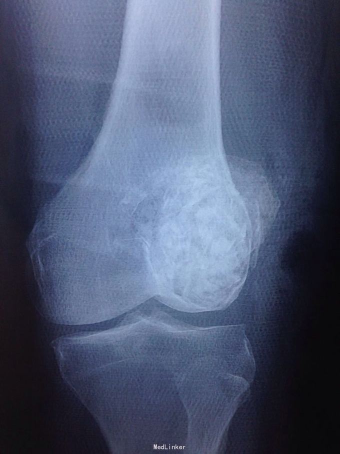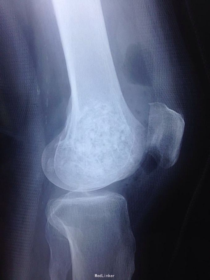男性51岁,左膝关节疼痛不适10余年。因症状较轻,不影响活动,未曾系统诊治。一月前因扭伤致疼痛加重,拍片检查,见股骨远端骨质异常,进一步行CT示股骨髁占位病变,考虑骨囊肿。既往有高血压,糖尿病病史。近期无低热,体重下降。