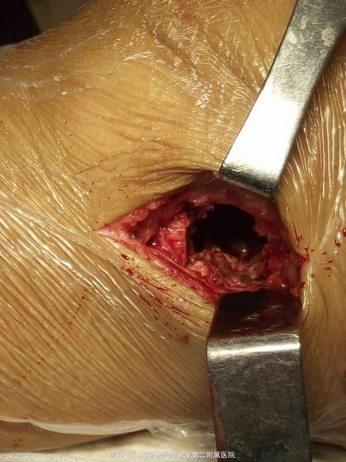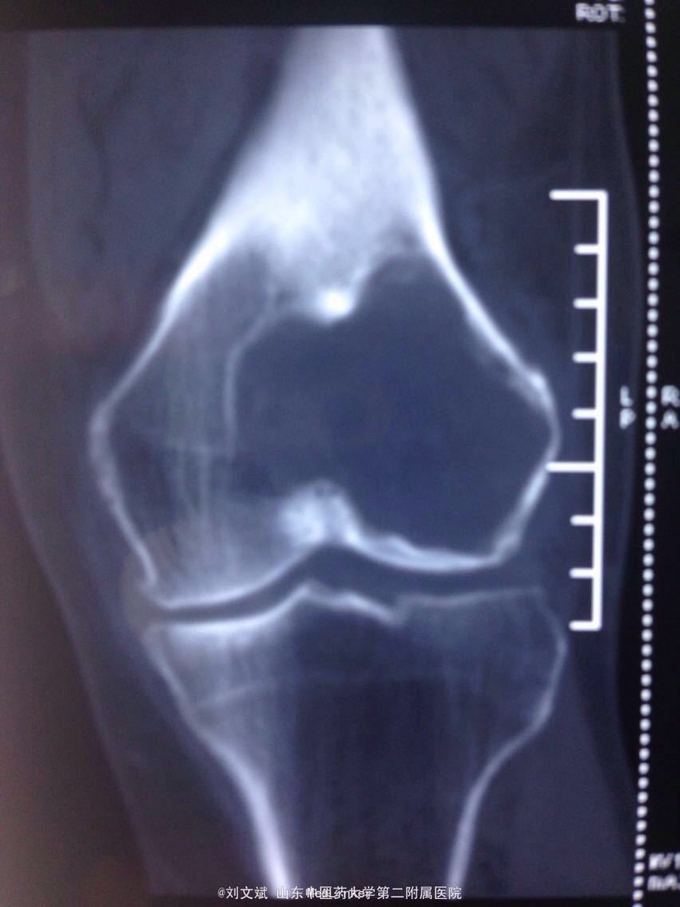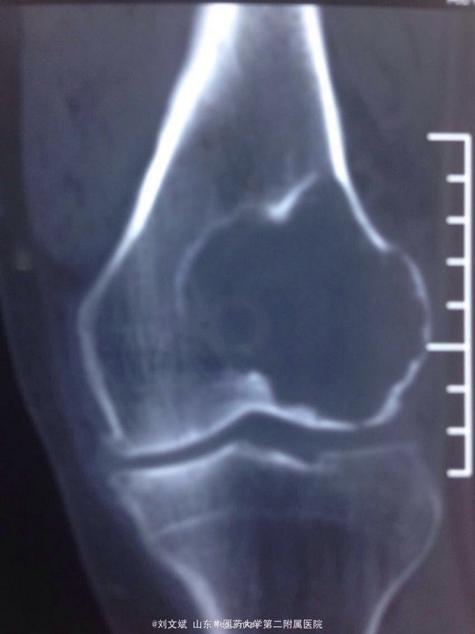 刮除占位组织如图所示,送病理检查了,结果还没回来。 没有全身症状,像是原发灶,骨皮质完整,没有明显骨膜反应请专家们看看,什么可能性比较大? 补上病理结果和术后片子