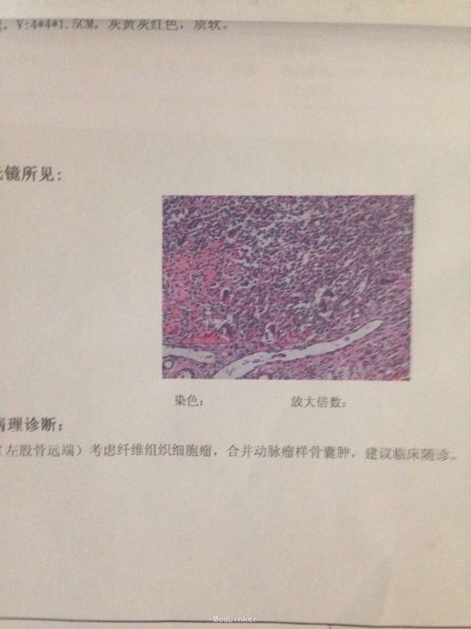 诊断:左股骨远端占位 因皮质完整,行手术开窗刮除,自体髂骨及同种异体骨混合植骨填充治疗。切取组织送病理检查