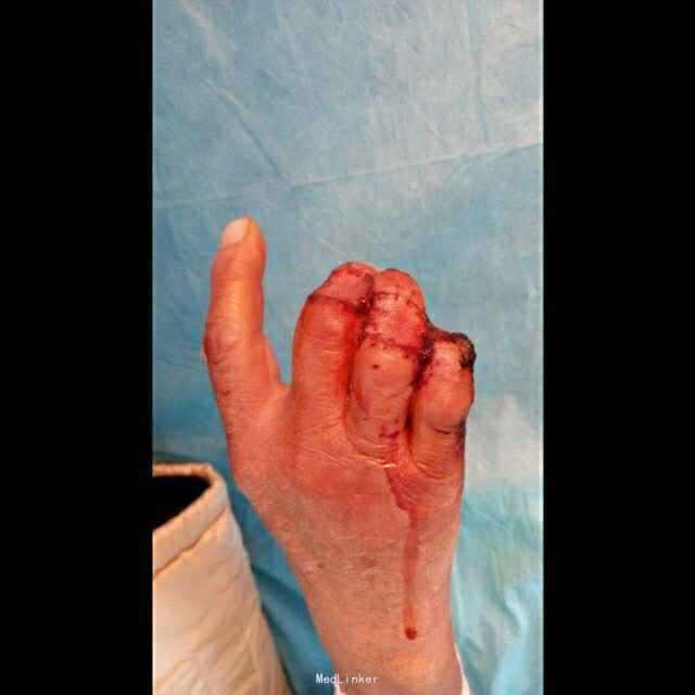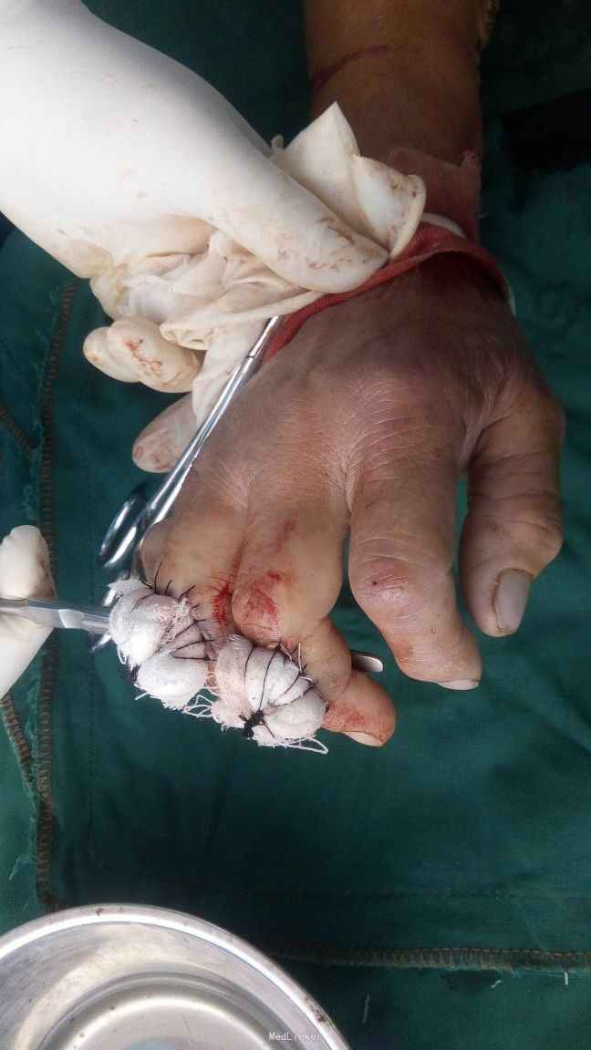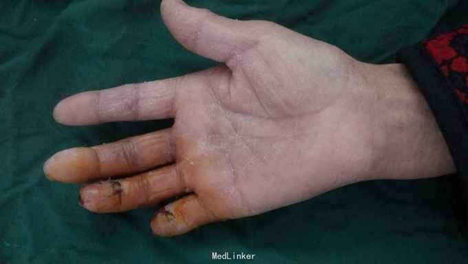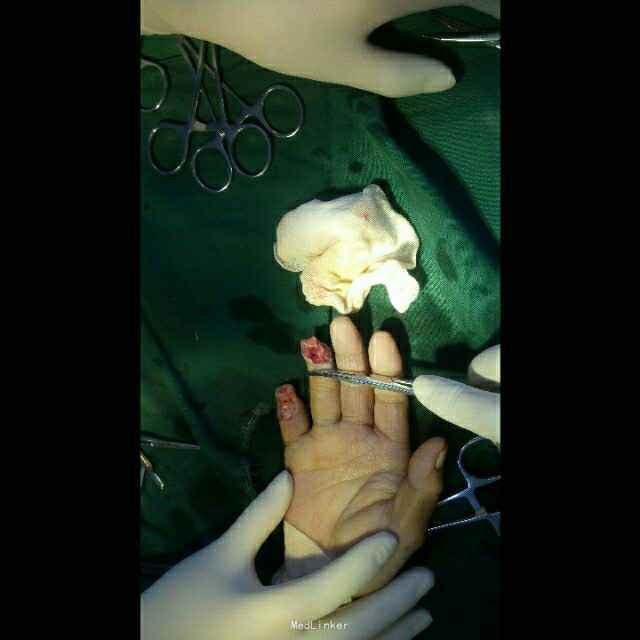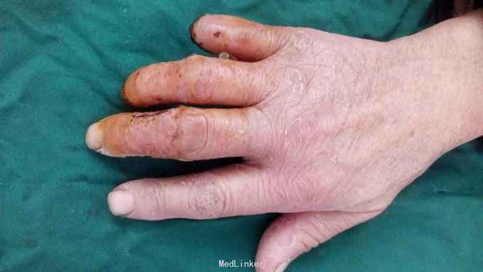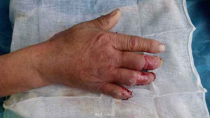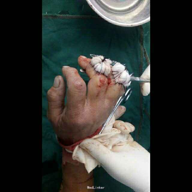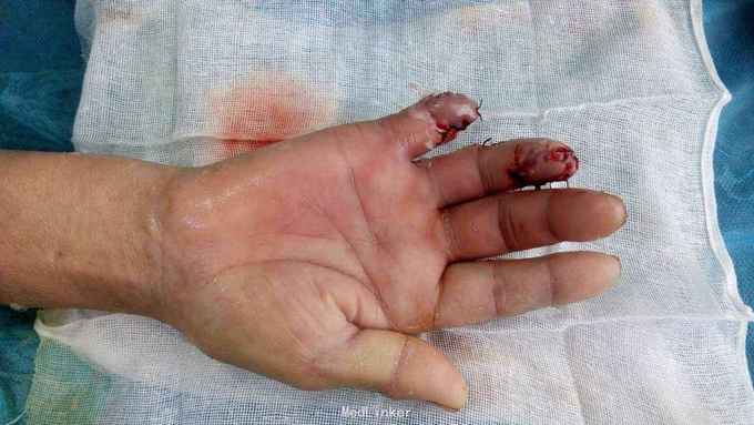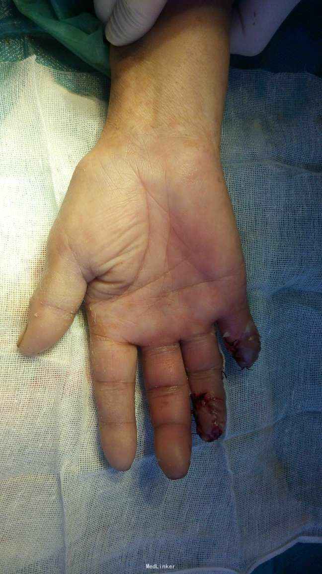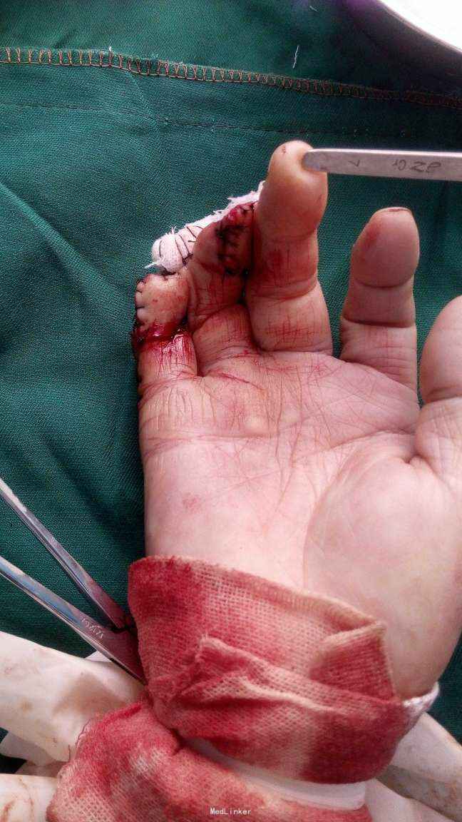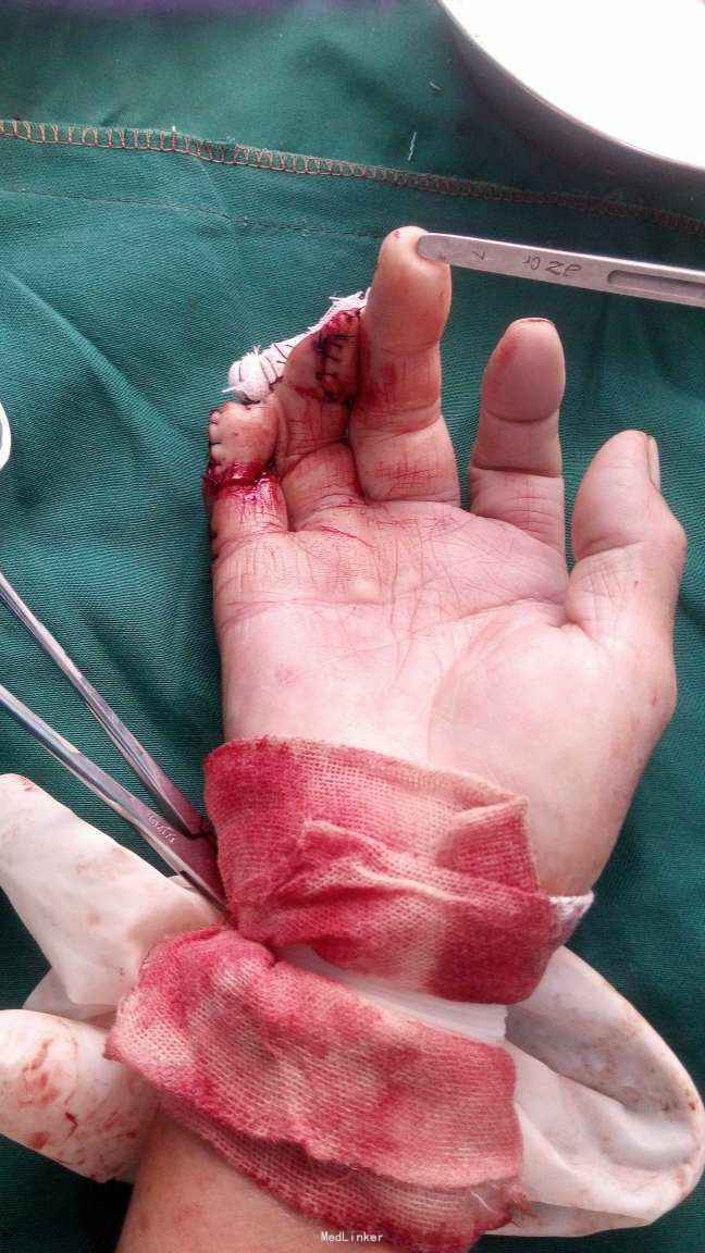 患者老年女性,不慎被机器绞伤右环、小指末节致疼痛出血活动受限