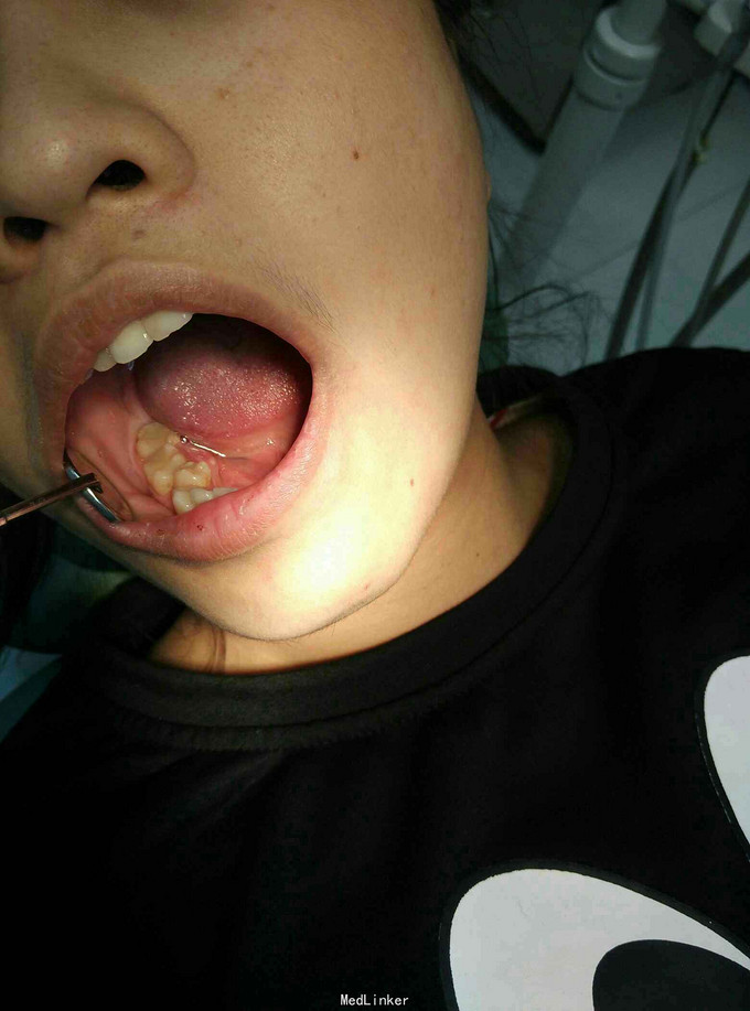 患者,女性,22岁,主诉‘右下后牙舌侧长包一周余’无明显疼痛。