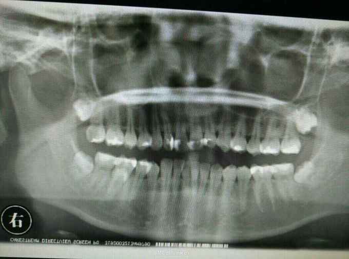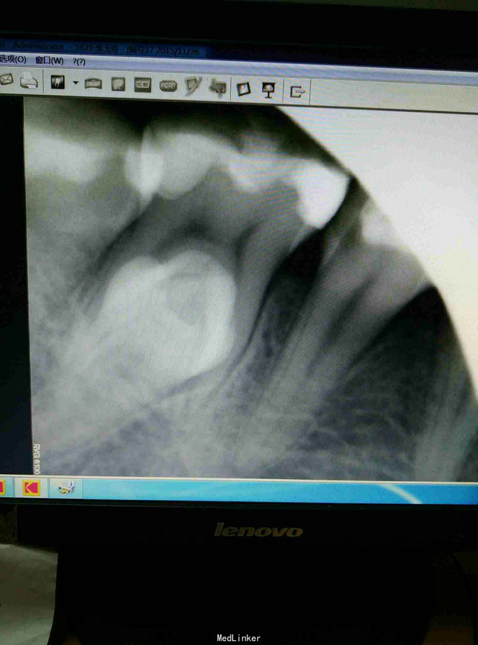体查见46舌侧一骨性隆起,扪诊质硬。粘膜表面稍白。余检查无特殊。予患者口腔全景片检查,排除颌骨病变。提示46根部高密度影,根交低密度影。于是再次行根交片检查,结果提示:46根部多生牙。