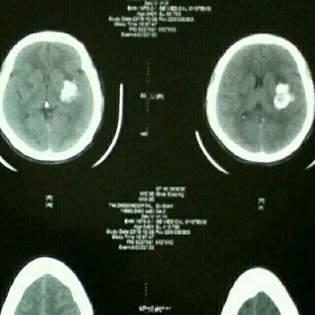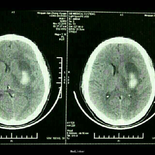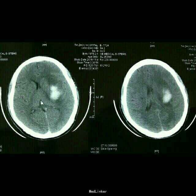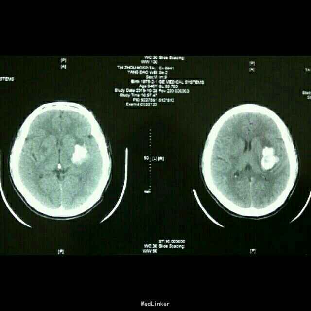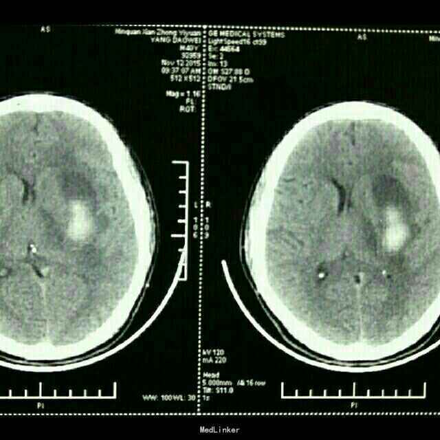 杨XX,男,40岁。 主诉:右侧上下肢无力伴失语15天。 病史:15天前在浙江务工时突然晕倒,随到浙江台州某医院就诊。神志清,精神差,查头颅CT示:“脑出血”,给予保守治疗。15天后家属要求转入原籍我院治疗。转入院时:神志清,精神可,血压:164/98mmHg,失语,右侧上下肢瘫痪,右侧上下肢肌力0级。 既往未检测血压。