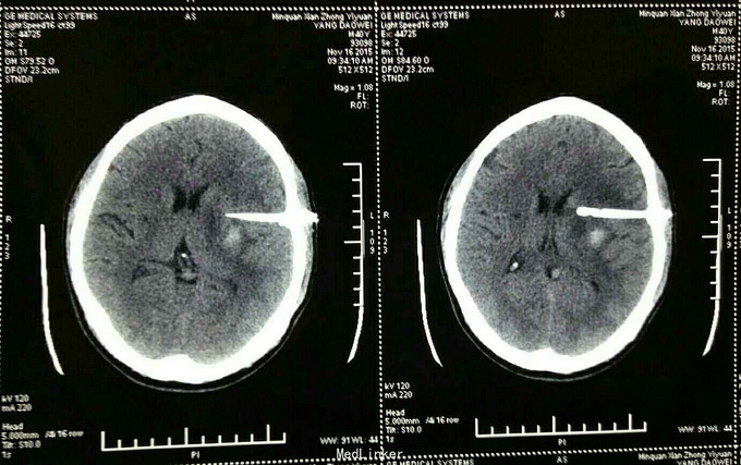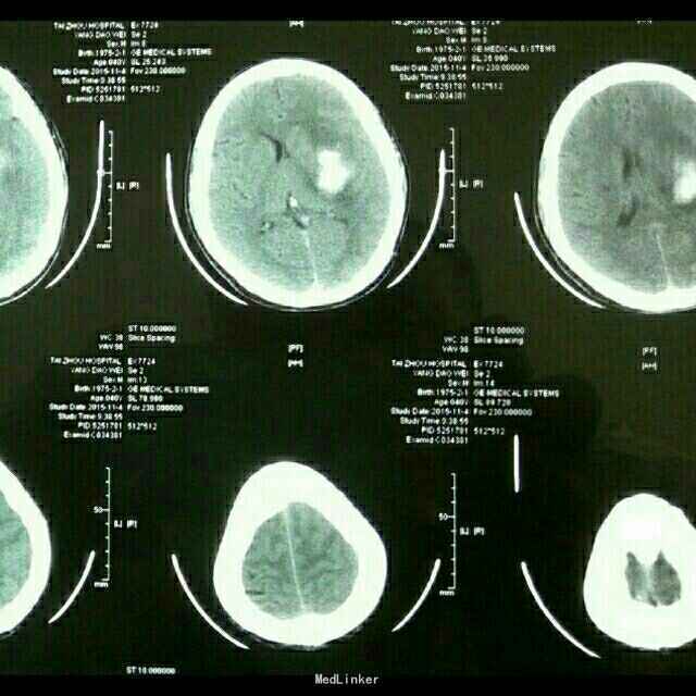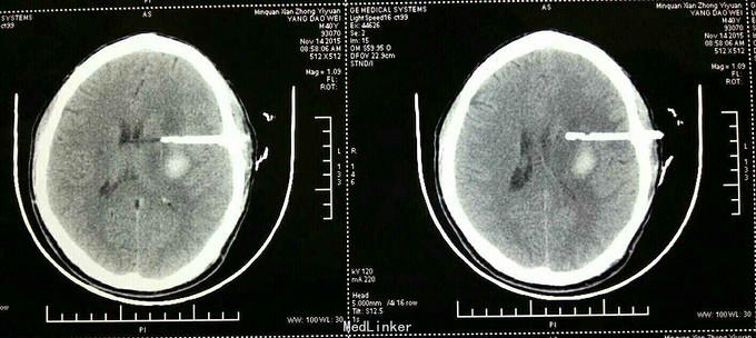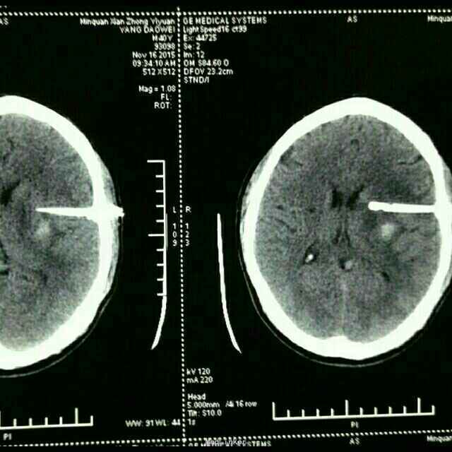 诊断:高血压脑出血 治疗:微创钻孔血肿引流术。 术后应用尿激酶溶解血肿,引流顺利。 术后第四天拔除引流管。