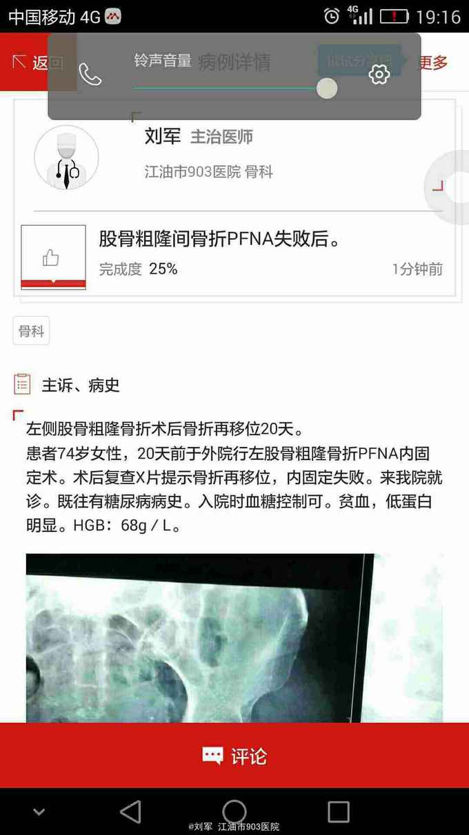 左侧股骨粗隆骨折术后骨折再移位20天。 患者74岁女性,20天前于外院行左股骨粗隆骨折PFNA内固定术。术后复查X片提示骨折再移位,内固定失败。来我院就诊。既往有糖尿病病史。入院时血糖控制可。贫血,低蛋白明显。HGB:68g/L。