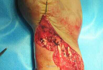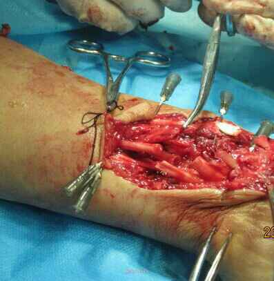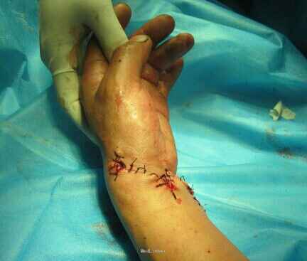 左腕部见长约5cm斜横型伤口,深达骨质,出血活跃,污染不重,可见断裂的肌腱及血管神经,食中无名指不能屈曲。末梢感觉麻木,余无异常。