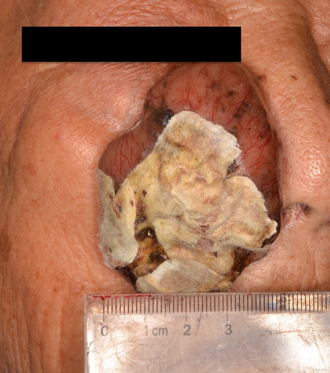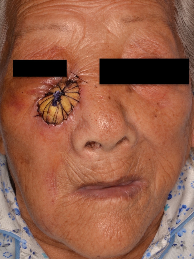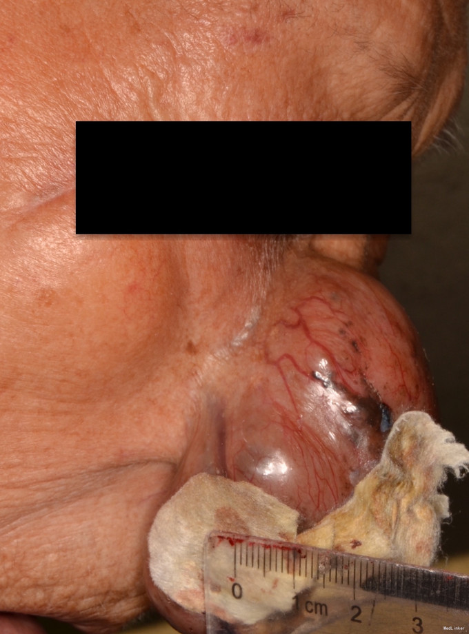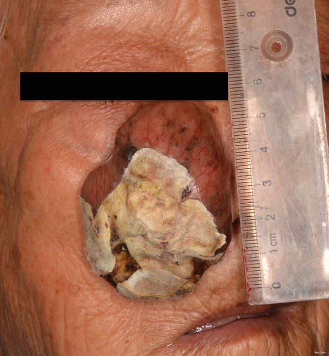 患者90岁,女性,因右面部肿块10余年,近期快速变大并破裂出血来院诊治。