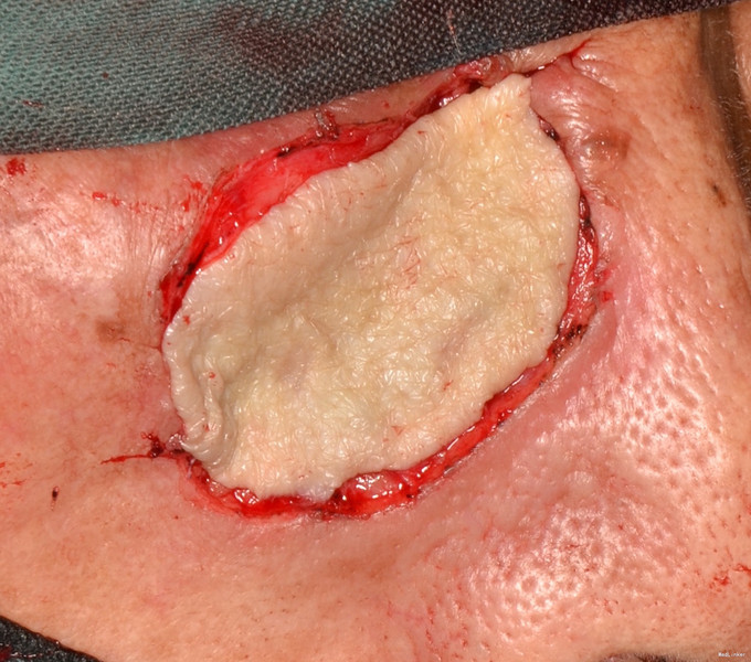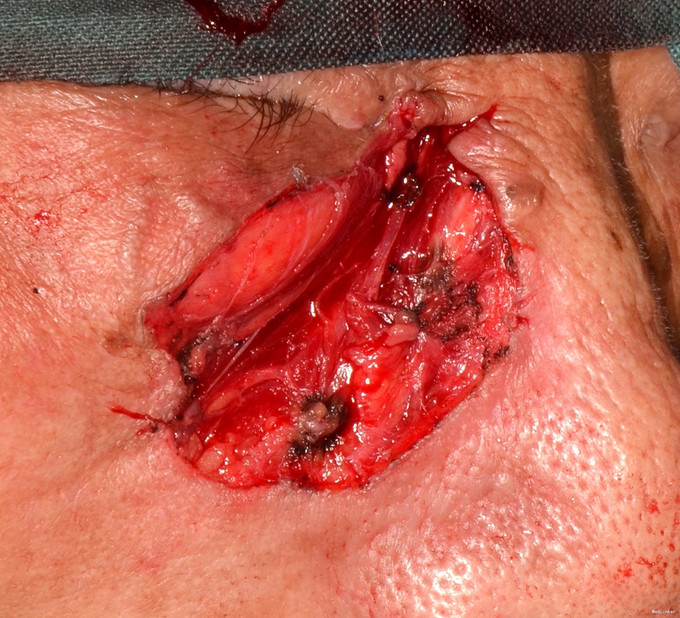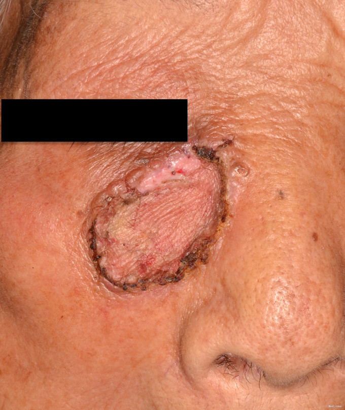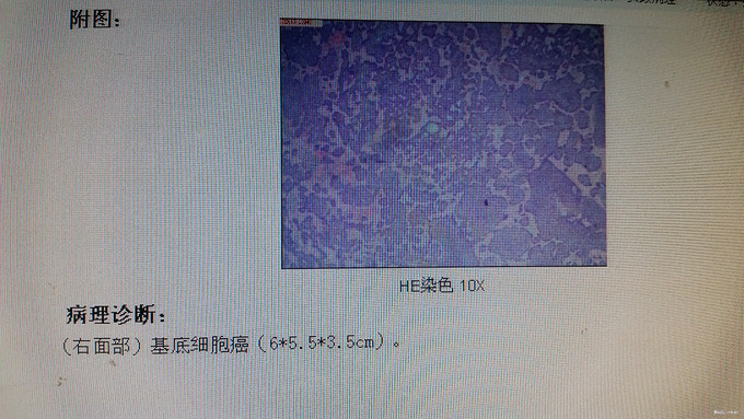 全麻下行右面部皮肤肿块切除+腹部皮片转移修复术。 术后病理:皮肤基底细胞癌。
