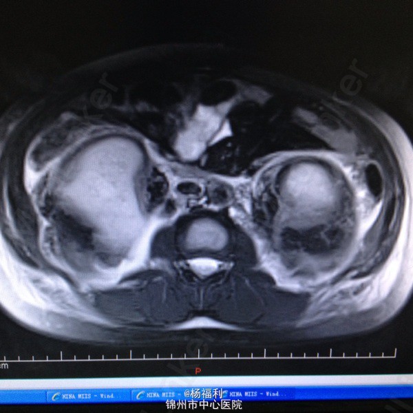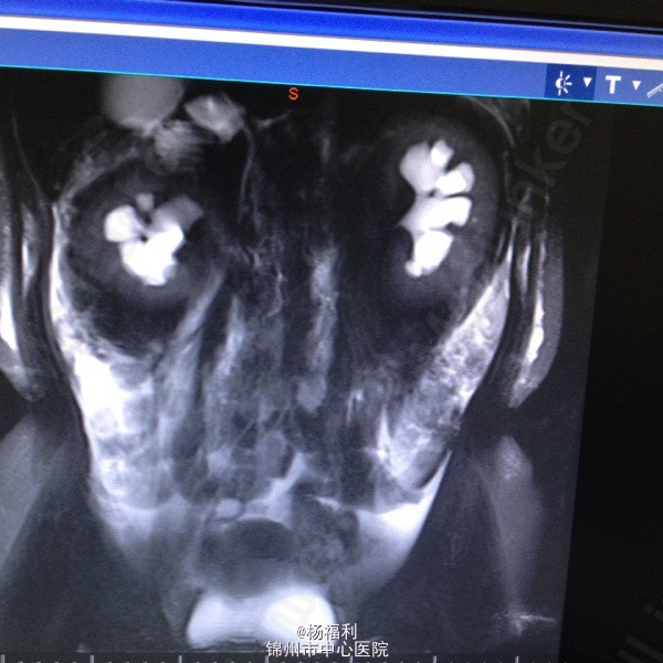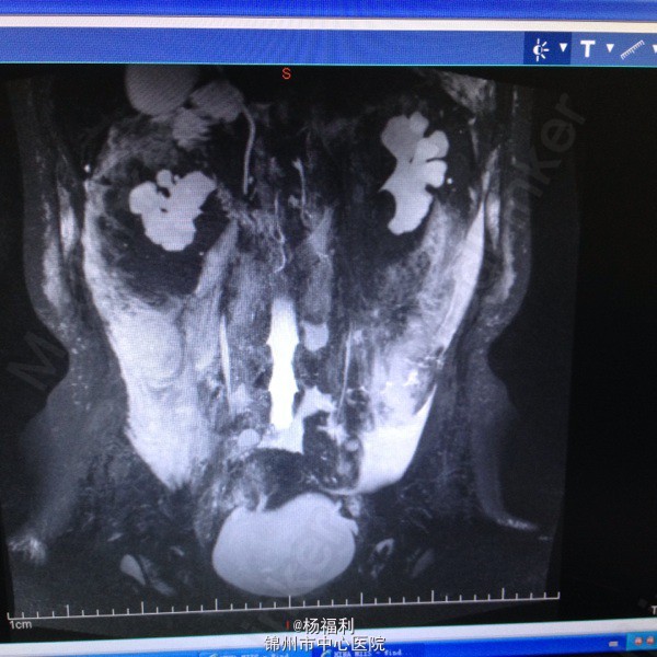 查体:上腹部压痛,无反跳痛、右侧压痛明显,右肾区叩击痛,左肾区轻叩击痛,双输尿管走形区无压痛。 辅助检查;泌尿系彩超:双肾积水。 血白细胞:9.99*10^9。 肾功能正常。 全腹部ct及MRU检查:见图片。