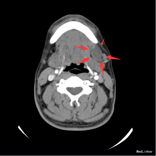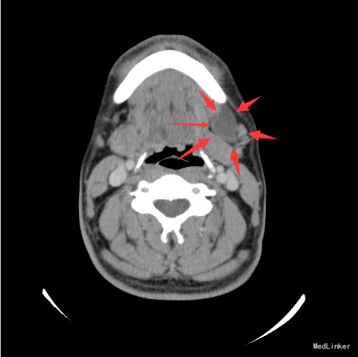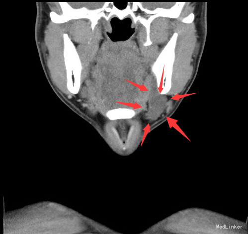 主诉:发现左颌下肿物10年余,复发增大3月余 病史:中年男性,隐匿性起病。患者10年余前无意中发现左颌下有一皮下肿物,无其他特殊不适,至外院就诊,诊断为“皮下囊肿”,予注射器抽液后肿物缩小。10年来患者未发现左颌下肿物增大。3月余前患者再次发现左颌下肿物,肿物逐渐增大,无畏寒、发热等不适。、