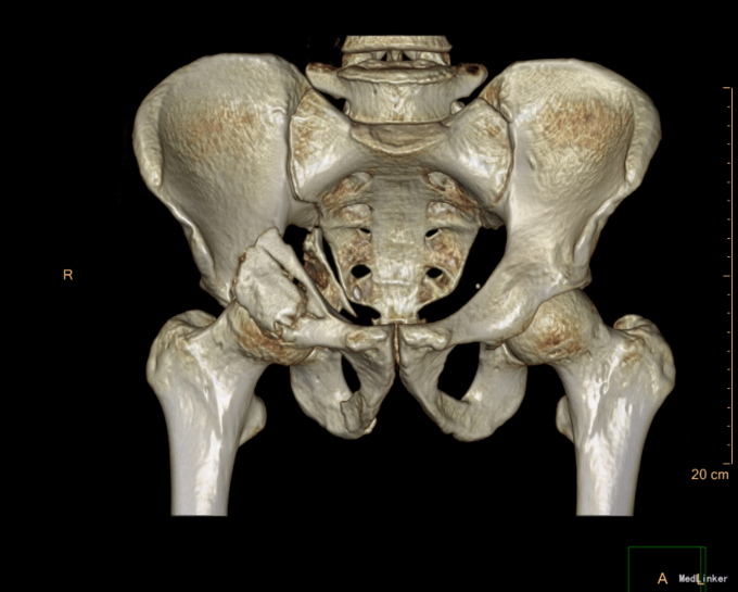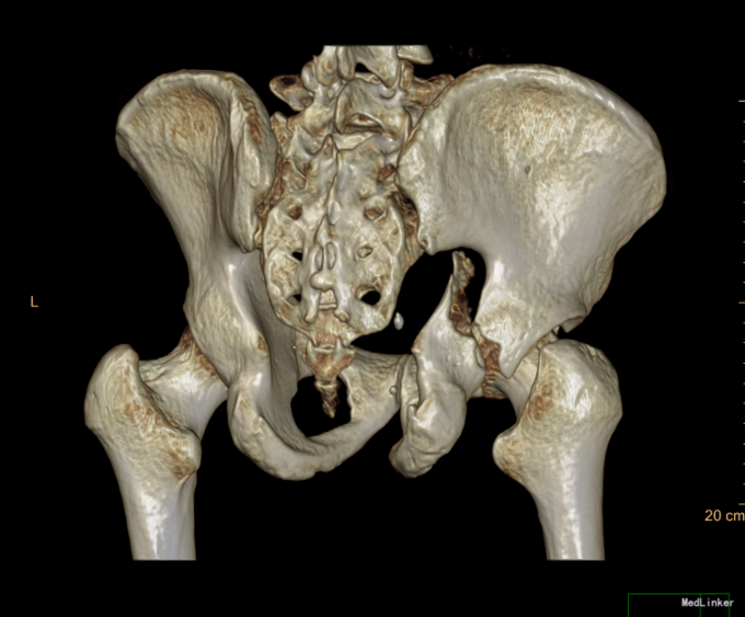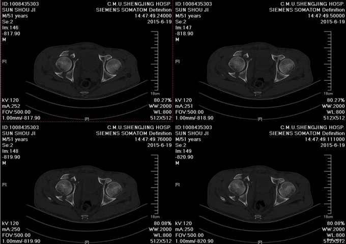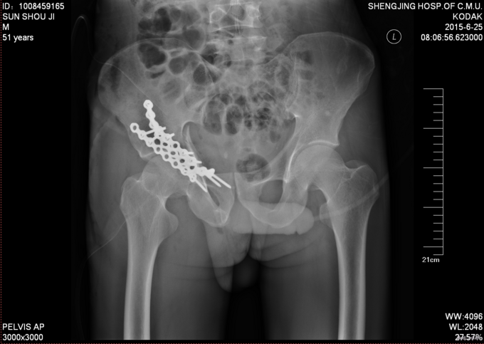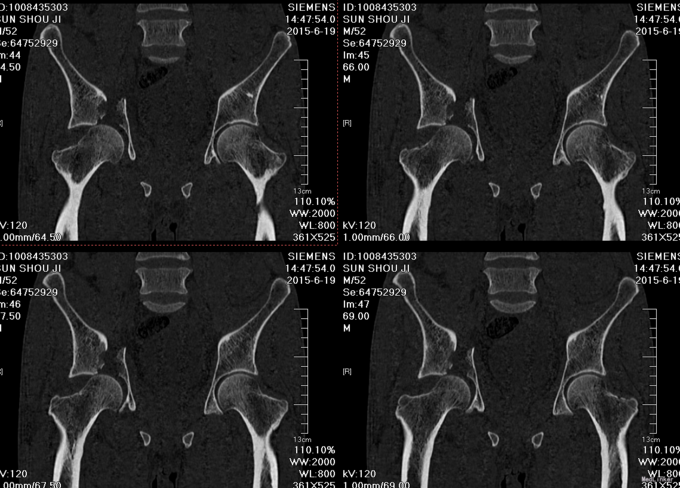 患者于2015年6月10日因车祸摔伤右侧髋关节,出现右髋部疼痛及活动受限。疼痛于活动后加重,休息可稍缓解。后就诊于营口市中心医院行骨盆三维CT示“右髋臼粉碎性骨折”,建议手术治疗,给予胫骨结节骨牵引术,患者于6月17日收入我院运动关节科病房,于6月19日转入我科。