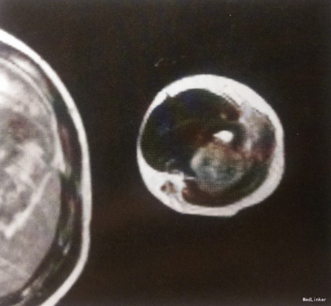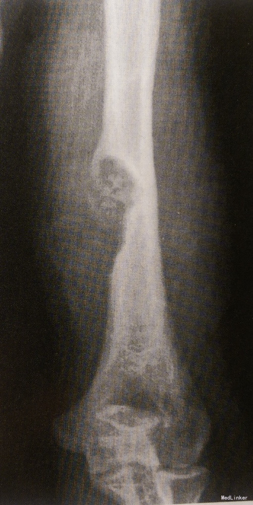 此例为发生于长管状骨的骨母细胞瘤,相对较少,起源于骨皮质,呈偏心性膨胀生长,表现为左肱骨中段内侧的骨质破坏,破坏区髓腔侧有硬化缘,皮质膨胀变薄,X线平片可清晰显示破坏区内散在的斑片状钙化灶,具有特征性。
