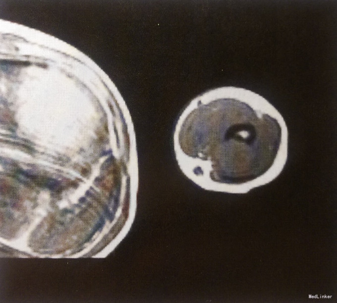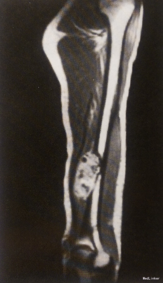 查体生命体征平稳,心肺腹体检无明显异常。 影像学检查:X线提示左肱骨中段内侧骨质破坏,破坏区髓腔侧有硬化缘,破坏区内见小斑片状钙化影、骨化影。MRI显示左肱骨后内侧骨皮质局限缺损,可见类圆形肿块,T1WI为等信号,T2WI为稍高信号,其内散在低信号灶,增强扫描肿块明显强化。