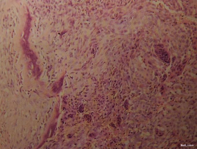 诊断:左肱骨骨母细胞瘤 治疗:手术治疗 病理:镜下见肿瘤由成骨细胞、骨样组织和骨组织组成,含有纤维性间质血管和散在的多核巨细胞。