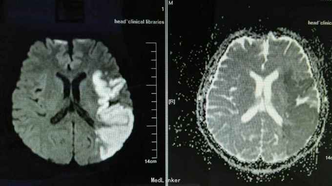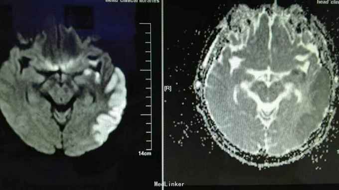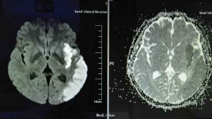 患者男性 年龄:44岁 主诉:言语不能伴右侧肢体力弱3天 现病史:患者于入院前3天出现言语不能,无法表达,执行“伸舌”等简单指令无法完成,偶尔可发出个别单音节字,可自行行走,但右侧肢体力弱,行走向右偏斜,上肢远端握拳差,无头晕头痛,进食无呛咳,无吞咽困难,无意识不清。 既往史:高血压病史8年,血压最高达180/100mmHg,间断口服降压药物(具体药名不详),未监测血压。否认糖尿病病史。嗜烟嗜酒多年。