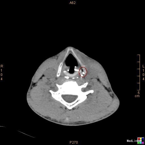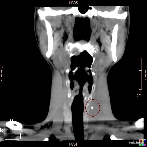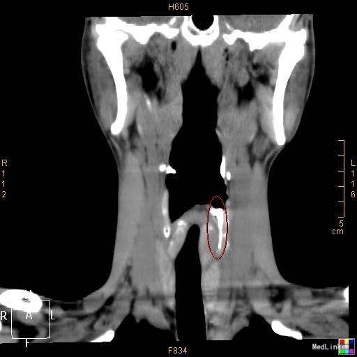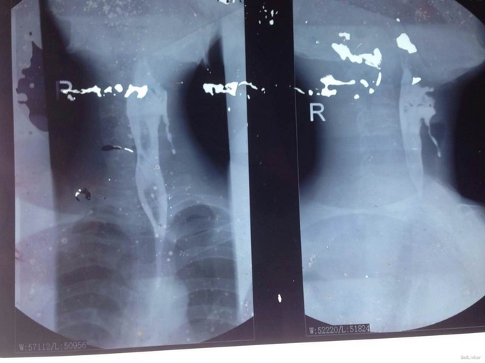 该患者在诊断上是有些困难,颈部多发脓肿是明确的,但是瘘口的位置不好确定,从而未能确诊,8年前患者行上消化道钡餐检查,诊断“食管瘘”,但是我们从8年前的影像上看,瘘口的位置太高,不像是食管的瘘口,考虑是不是梨状窝的瘘道,为了进一步确诊,我们给患者行了胃镜检查,结果胃镜发现左侧梨状窝有1个3mm大小的小孔,胃镜未能通过,食管未见明显的瘘口。为了更加明确瘘口的位置,我们与影像科商议后决定口服造影剂后行颈部CT平扫,因怕钡餐沉积在脓肿内不好排出,我们采用了口服碘化油。此次影像明确了瘘口的确在左侧梨状窝。最终诊断:左侧颈部多发脓肿;左侧梨状窝瘘道形成。 治疗:入院后予抗感染、禁食、营养支持等治疗,患者感染得以控制,请耳鼻咽喉科会诊后建议转科治疗。