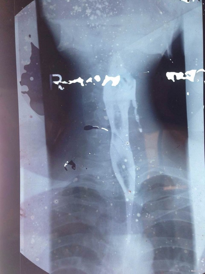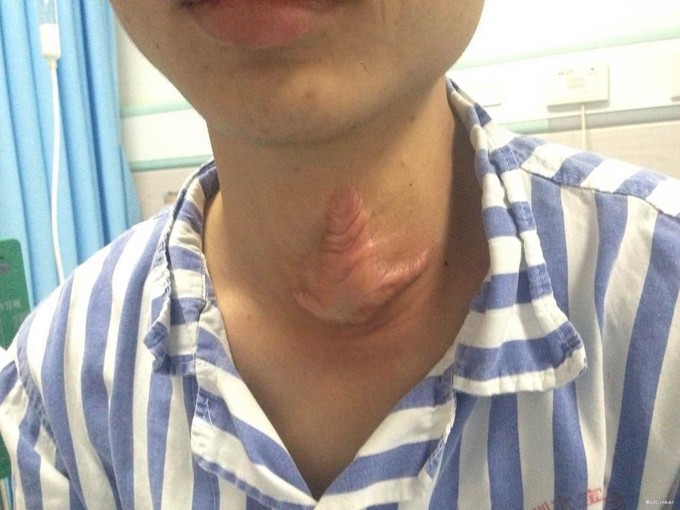 主诉:患者27岁男性,慢性起病,急性发作。因“反复颈部红肿、疼痛8年,再发1月”入院。 病史:该患者缘于8年前开始反复出现颈部红肿、疼痛、伴脓肿形成,8年前曾于当地医院反复行颈部脓肿切开引流术,术后好转,但反复发作多次;2008年12月该患再次颈部红肿、疼痛发作,并于当地医院就诊,行钡餐造影后考虑“食道瘘”,行手术治疗后好转,术后7年未再发作;1月前患者再次出现颈部红肿、疼痛,抗感染治疗后症状略好转,但1月来病情反复,逐渐加重;不伴呼吸困难、吞咽不适;无心悸、胸闷、气促,咳嗽;无多饮、多食、消瘦表现,无声音嘶哑或音调低沉,无多言、性情急躁、易激动等精神异常表现。门诊以"颈部脓肿?"收入普外科。患者自起病以来精神、胃纳、睡眠可,大小便正常,体重无明显变化。