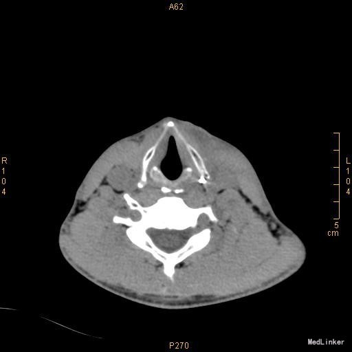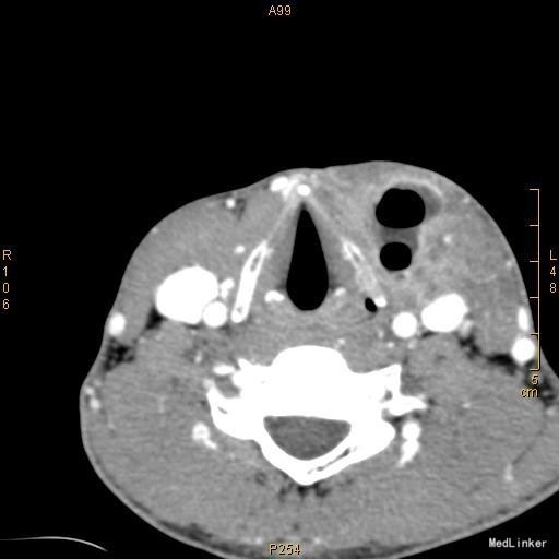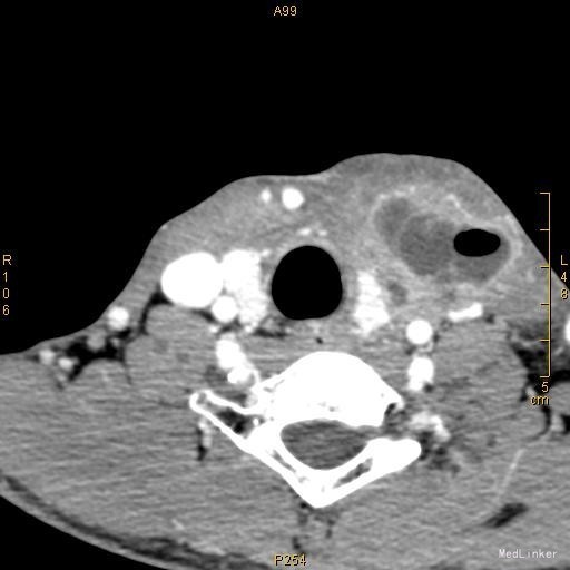 查体:颈前有明显手术瘢痕,左侧颈外侧区可触及一约3cm×3cm大小肿物,质韧,边界不清,表面光滑,不可随吞咽上下移动,触痛明显,颈部未闻及明显血管杂音。 辅查:2015-11-16我院颈部增强CT示左侧颈部感染,多发脓肿形成。