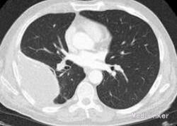 患者:男性,68 岁,出现咯血、胸痛,偶有发冷;无发热、体重减轻和呼吸困难。该患者童年有结核病病史,未接受抗结核治疗,后右下胸膜出现胸膜钙化且保持稳定。