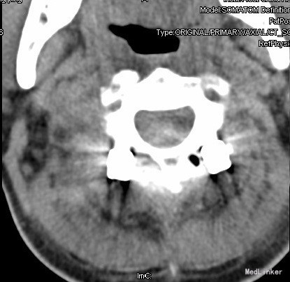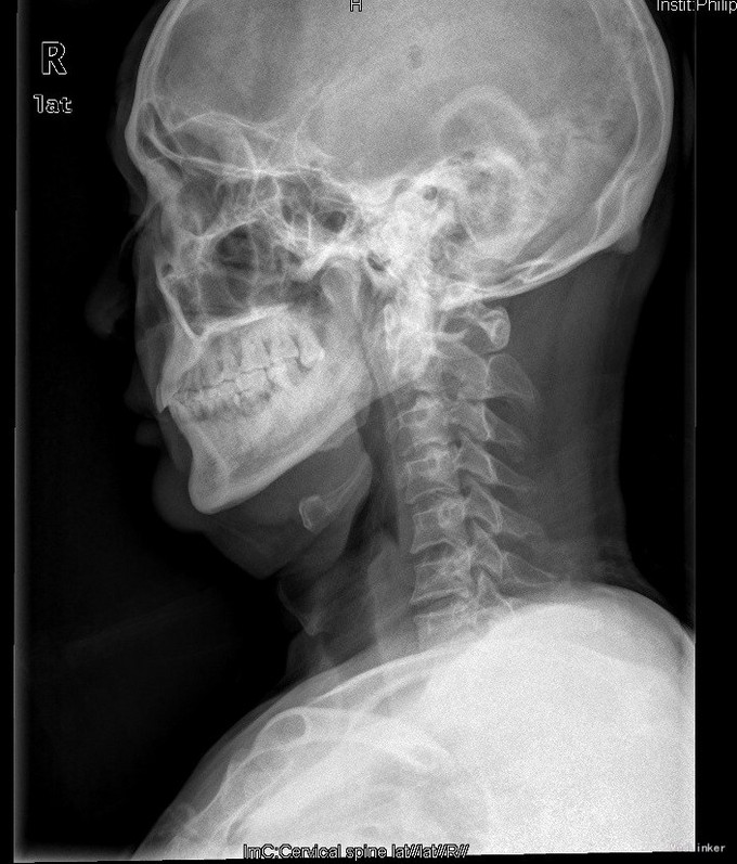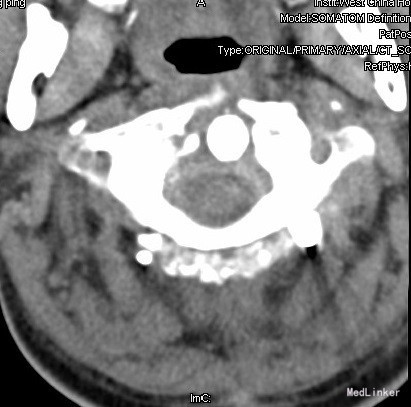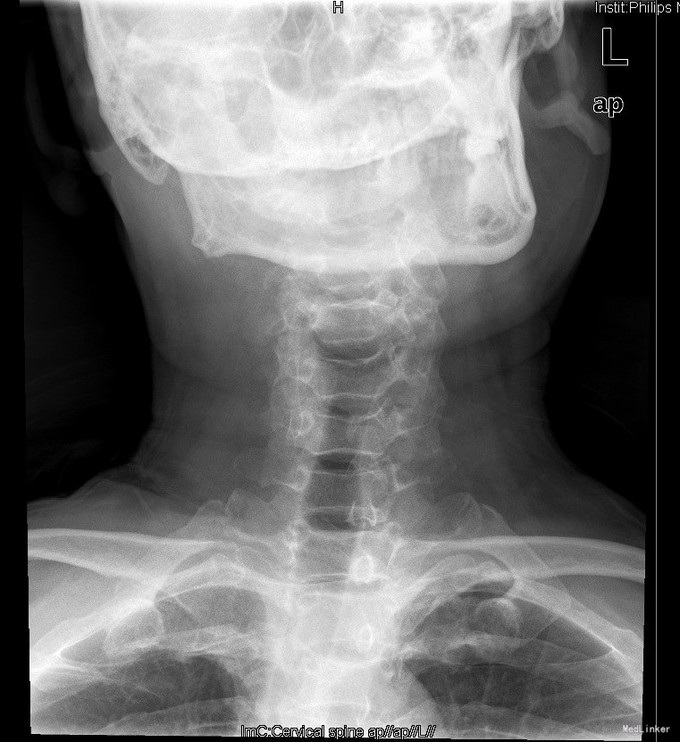 查体:查体:T:36.7oC,P:80次/分,R:20次/分,BP:137/82mmHg。神志清楚,无病容,皮肤巩膜无黄染,全身浅表淋巴结未见肿大。。颈静脉正常。心界正常,心律齐,各瓣膜区未闻及杂音。胸廓未见异常,双肺叩诊呈清音,双肺呼吸音清,未闻及干湿啰音及胸膜摩擦音。腹部外形正常,全腹柔软,无压痛及反跳痛,腹部未触及包块,肝脏肋下未触及,脾脏肋下未触及,双肾未触及。双下肢无水肿。视:平车推入病房,颈椎颈托围领固定,颈部、前额部及全身皮肤未见皮损及异常。触:颈1-4棘突及椎旁明显压痛、叩击痛,感觉正常,四肢肌张力正常。动量:颈椎活动受限,尤以旋转受限为重。双侧肱二头肌反射、肱三头肌反射、膝反射正常,双侧babinski征阴性,右侧Hoffmann征阳性、左侧阴性。 辅助检查:颈椎X线片、MRI、CT提示:寰椎椎板前弓骨折,寰枢关节旋转半脱位
