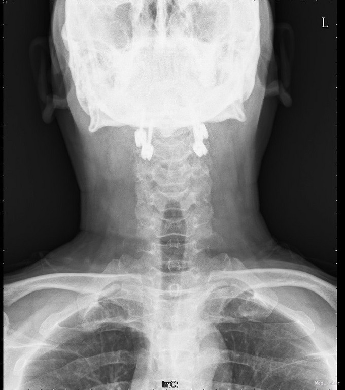 主诉:车祸外伤后颈部疼痛伴活动受限1+月 现病史:患者自述于2012.12.6日乘车时不慎发生车祸,紧急刹车后,患者前额部撞在前排座椅上,患者自觉颈部、耳后疼痛,伴颈部活动受限,遂急至“井研县人民医院”就诊,并行头颅CT、颈椎X线片后,考虑“颈部软组织受伤”,遂建议在家休养,患者为求进一步就诊,至“市人民医院”就诊并行颈椎MRI检查,考虑“寰椎前弓骨折”,建议至上级医院就诊。患者遂至我院就诊,经检查并拍片考虑:寰枢椎骨折并脱位。建议行“牵引”治疗,依据治疗结果再决定手术治疗还是保守治疗。患者遂至“某医院”住院牵引治疗两周后再次来我院门诊就诊,经检查并阅片考虑“寰枢椎陈旧性骨折并脱位”并收住入院,拟行手术治疗。 患者自外伤以来,神清,精神良好,无头痛、头晕,无恶心、呕吐,无腹痛、腹胀,无高热、寒战等不适。