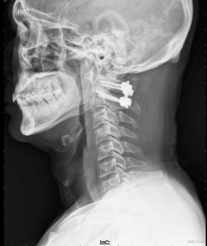 诊断:1.陈旧性寰枢关节旋转脱位2.陈旧性寰椎前弓骨折 治疗:全麻下行:行经前路寰枢椎脱位切开撬拨复位+经后路寰枢椎侧块螺钉内固定、去髂骨后外侧植骨融合术
