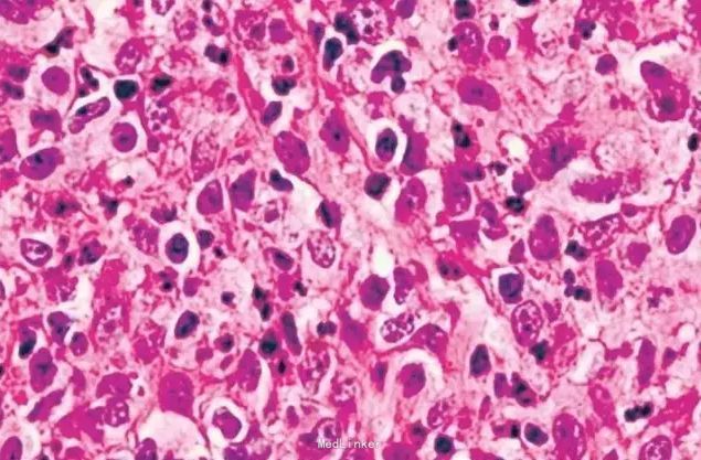 体检:左侧耳大神经,双侧腓总神经粗大。皮肤科检查:面颈部、躯干、腋下、四肢散在丘疹、结节、部分破溃结痂;双侧眉毛外2/3脱落,双侧腋毛完全脱落。部分皮疹温度觉减退,痛觉及触觉未见明显异常。皮肤组织病理检查:表皮大致正常,真皮浅中层可见结节、团灶状细胞浸润,由散在的间变性大细胞混合淋巴细胞、组织细胞、中性粒细胞、嗜酸性粒细胞等组成,其中间变性大细胞胞质丰富,核大,核仁明显,胞浆透亮,偶见核分裂。免疫组化结果:CD3、CD4、CD5、CD30阳性;CD8、CD20阴性。两次抗酸染色(-)。