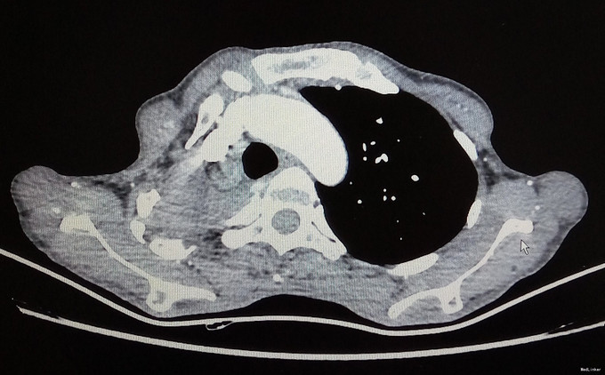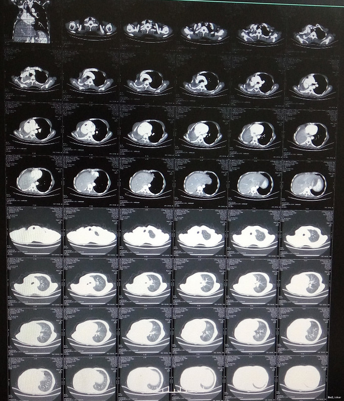 查体:生命体征平稳,腹部饱满,无腹壁静脉曲张,腹韧,无压痛、反跳痛及肌卫,移动性浊音(+),肠鸣音6次/分。 辅助检查:胸部CT:右肺缺如。血钾:3.24mmol/l(见图1-2)。