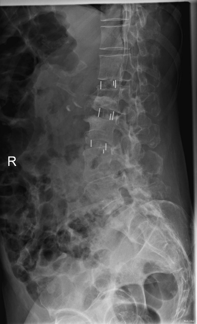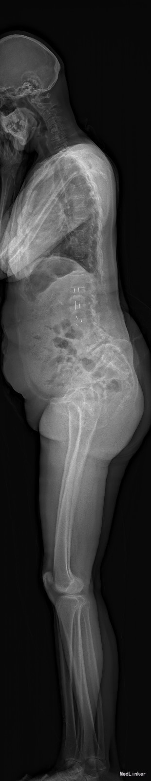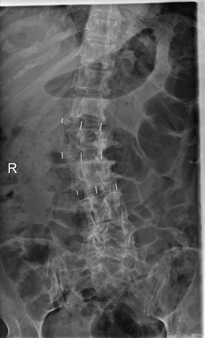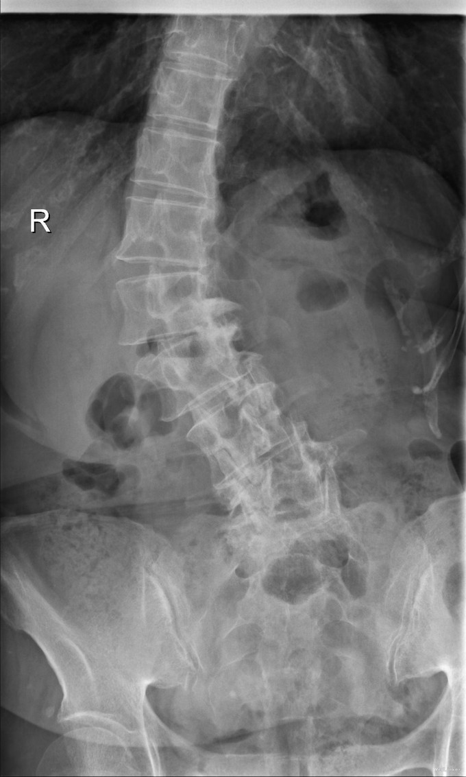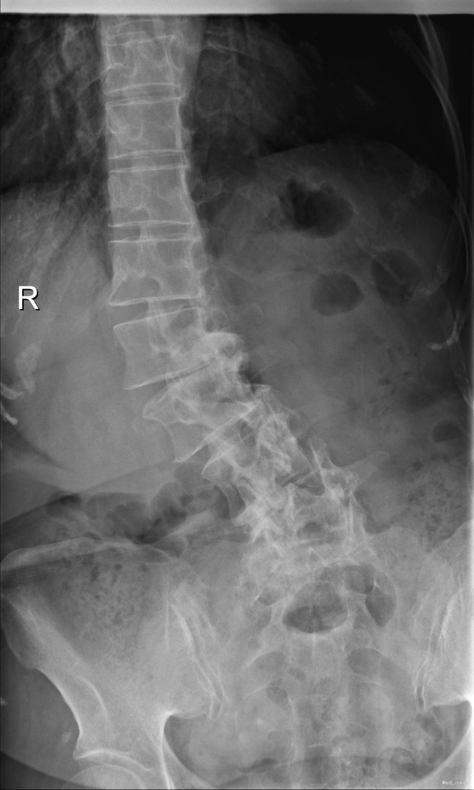 主诉:右下肢麻木11年,腰部酸痛无力 现病史:女性患者,65岁,患者于11年前无明显诱因下出现右下肢麻木,自大腿至右踝部,站立位加重。未予重视,后期出现腰臀部僵硬,弓背僵硬无力,自主行走距离不足200米,曾于06年经X线平片及MRI检查:腰椎椎管狭窄伴有腰椎滑脱,椎间盘突出等。
