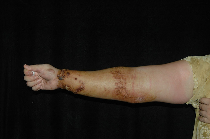 患者女,31岁。因反复四肢水疱、脓疱、红斑,自觉瘙痒、疼痛1年余,加重1月来我科就诊。患者1年余前无明显诱因于右手第4指突起数个红色丘疹,后形成水疱、大疱、脓疱,同时周围皮肤出现红肿,自觉瘙痒及疼痛,但无发热。皮损渐进展至右腕部、右前臂、双足底。10月前患者于腹部及背部出现多发红色丘疹,皮损逐渐增多、增大,并融合成红色斑块,皮损肿胀、发硬。患者曾于当地医院诊断为“带状疱疹”,“掌跖脓疱病”等,予口服“更昔洛韦”、“强的松”(用量不详),皮损可消退,但停药后四肢皮损复发。曾多次于当地诊所静脉输注“头孢类抗生素”无效。近1年来四肢皮损反复发生,不予治疗亦可逐渐好转。1月前患者右上肢皮损复发,同时出现右上肢弥漫性红肿、发硬,伴疼痛,遂来我院就诊。 既往史、个人史、家族史均无特殊。