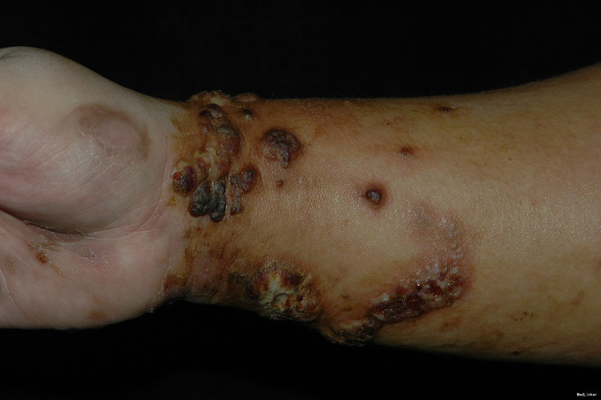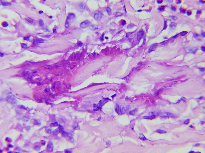 嗜酸性蜂窝织炎(Eosinophilic Cellulitis)是一种以反复发作的红色水肿性斑块为特点的疾病,最早由Wells于1971年首先报告,又称Wells综合征(Wells syndrome)。本病发病无性别差异,患者年龄跨度大,平均37岁。疾病在发病早期类似于急性蜂窝织炎,皮肤病理表现为显著的炎症性肉芽肿特征。皮损好发于四肢和躯干。常表现为边界清晰、水肿性、触之坚实的环状红色斑块,类似蜂窝组织样,但也可有其他多种临床表现,包括水疱、结节、丘疱疹和瘙痒性剥脱性炎性丘疹。有些患者可引起疼痛和瘙痒,皮损愈后不留瘢痕。 本病病理变化:急性期皮损活检可见真皮水钟,并有大量的嗜酸性粒细胞浸润,表皮下偶见水疱。亚急性期真皮有弥漫性组织细胞和嗜酸性粒细胞浸润,部分碎裂的嗜酸性粒细胞围绕着坏死的胶原纤维形成斑块状浸润,可以见到大而淡染的组织细胞及异形巨细胞围绕嗜酸性不定形物呈栅栏状排列的“火焰像”。消退期组织细胞渐进性坏死,类似肉芽肿的改变,仍有“火焰像”持续存在。根据患者的临床特征及病理上“火焰像”的特点可诊断本病。本例患者起病时皮疹不典型,开始时为单侧发病,表现为红色小丘疹、后逐渐形成水疱、大疱,故曾被诊断为“带状疱疹”,皮损进展到对侧上肢并出现脓疱后又被诊断为“掌跖脓疱病”,最终取皮肤病理而确诊。 本病发病原因的机制尚不清楚。部分患者血清中可以出现抗核抗体,组织病理上可见广泛发生的纤维蛋白样坏死,小血管炎及嗜酸性粒细胞增多,故认为可能为自身免疫性疾病,本病是否是原发性独特的疾病还是对其他可能的过敏刺激的反应还不清楚。它与昆虫叮咬、盘丝虫病、肠道寄生虫病、水痘、腮腺炎、破伤风疫苗接种、药物反应、骨髓增生症、特应性素质、嗜酸性粒细胞增多综合征和真菌感染有关。 本病对抗生素治疗无反应,该患者曾使用“头孢类抗生素”治疗无效也印证该点。有效的治疗包括口服抗组胺药、氨苯砜或小剂量激素,UVB或PUVA也可能有效。本患者经小剂量激素治疗后病情有改善,目前仍在随访中。