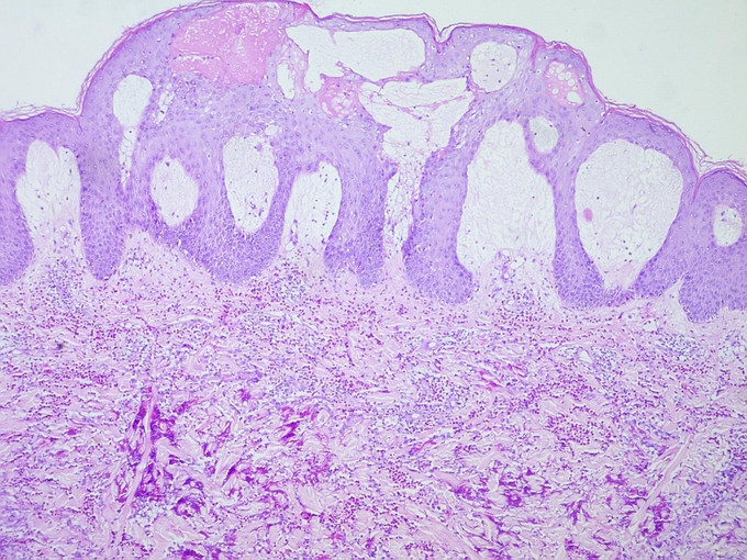 体格检查:系统检查无异常。皮肤科检查:右上肢弥漫性红肿,非可凹性,皮温高,触之较硬。双手、右前臂散在粟粒至黄豆大小水疱、大疱、脓疱,尼氏征阴性,左前臂、双足跖有少量大小不一黄色结痂面。四肢、背部、腹部多发大小不一、境界欠清之色素沉着斑。 实验室及辅助检查:血常规WBC 15.84×10*9/L,EOS% 20.4%,EOS 3.88×10*9/L 。疱液细菌培养及真菌培养均未见异常。ANA、dsDNA,、ENA谱均阴性。组织病理检查:表皮棘层不规则肥厚,皮突延长,真皮乳头高度水肿,真皮全层和皮下脂肪可见大量嗜酸性细胞浸润,并可见火焰现象。