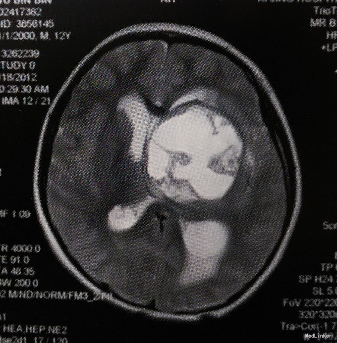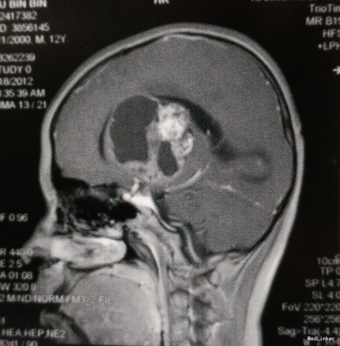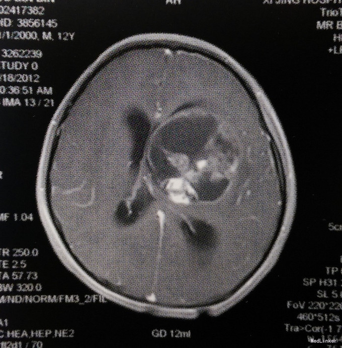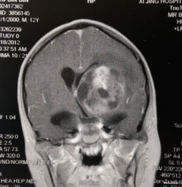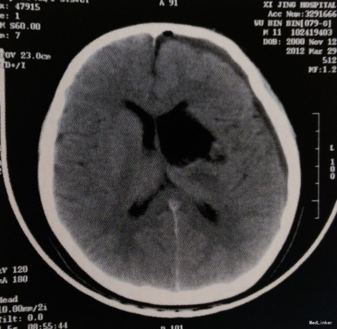 患者,男,11岁。主因头痛2周、意识障碍2天入院。 患者2周前出现持续性头胀痛,1周前出现呕吐,入食即吐,2天前昏迷。在当地医院行头颅CT检查:颅内肿瘤。遂来我院急诊中心就诊,给予“脱水、营养神经、对症处理”,随即急诊以“左侧基底节区及丘脑肿瘤”收入我科。既往体健,无其他相关病史。