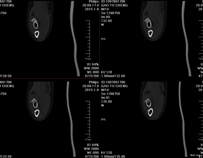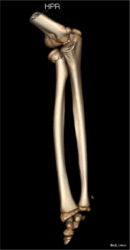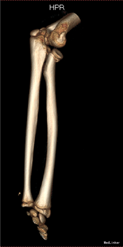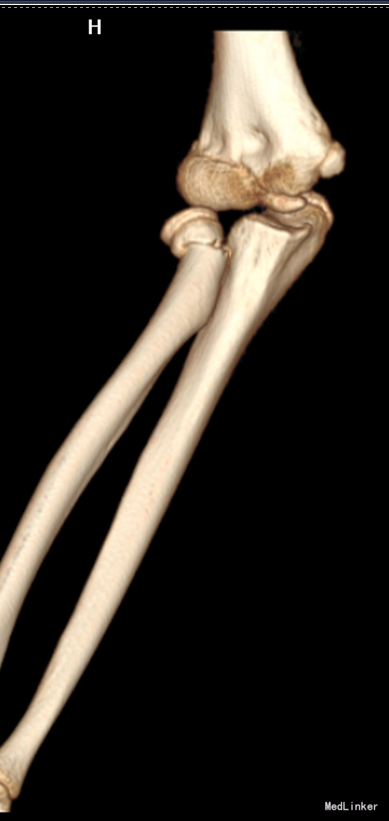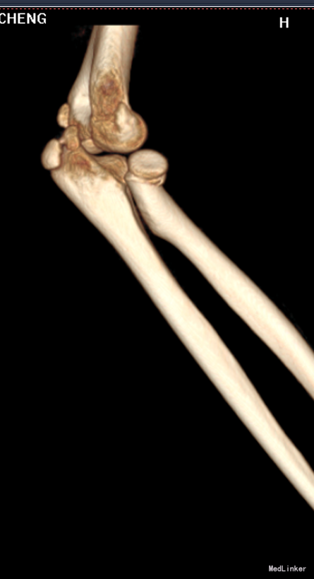 患者自述于2015年1月8日14时余不慎摔伤,右手伸直着地,感觉疼痛、肿胀,活动受限。遂急诊来我院,急诊给予行右肘关节三维CT检查,提示:右桡骨近端骨折。现为求进一步系统治疗送入我科,急诊以“右桡骨颈骨折”为主要诊断收入我科