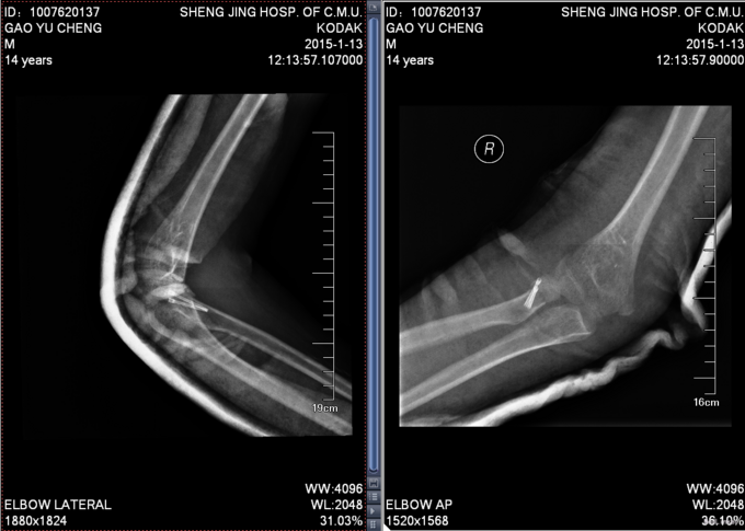 患者入院后肘关节肿胀明显,消肿约1周后,查无明显手术禁忌症后,全麻下行左桡骨小头骨折空心钉内固定术。术后给予患者石膏固定,定期换药,14天后拆线出院,建议石膏固定4周。