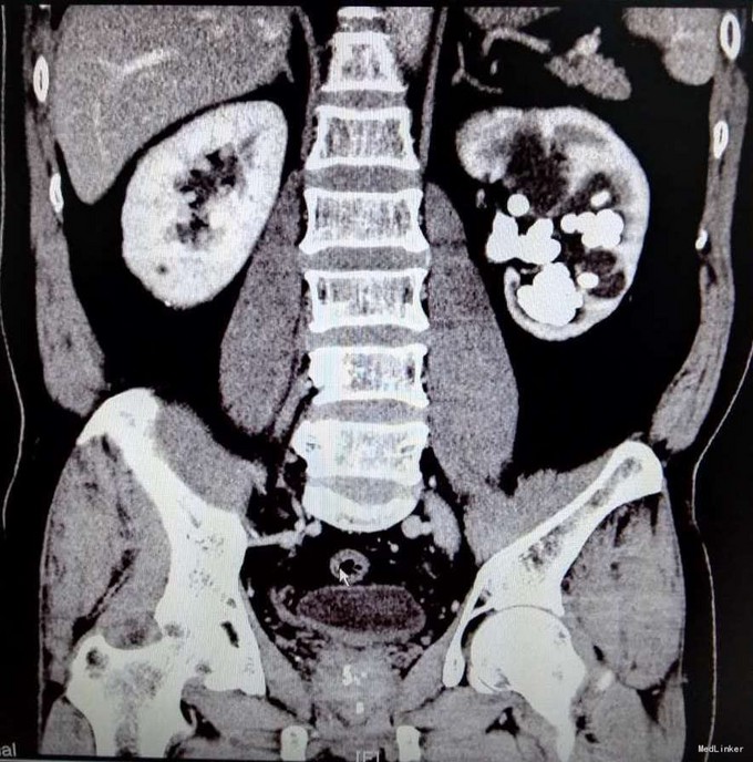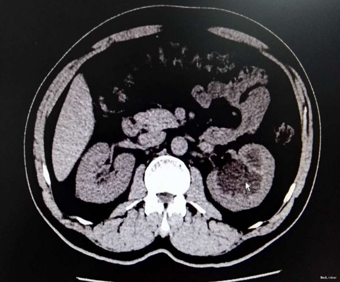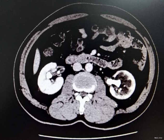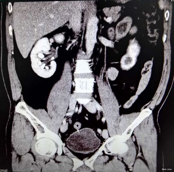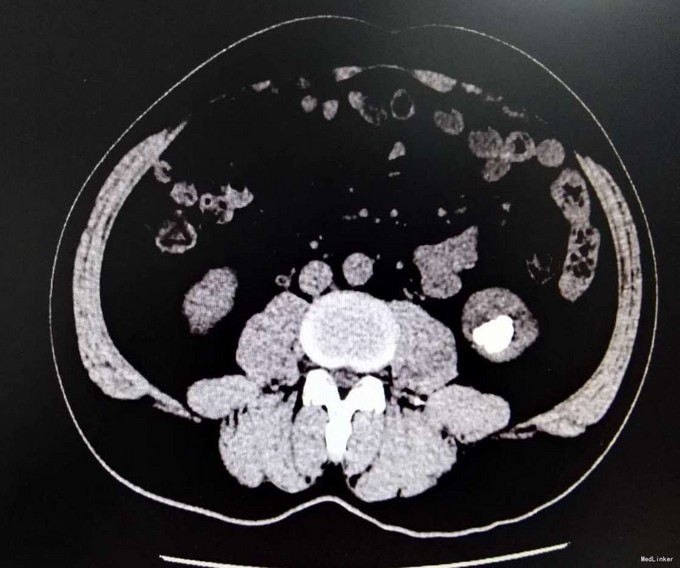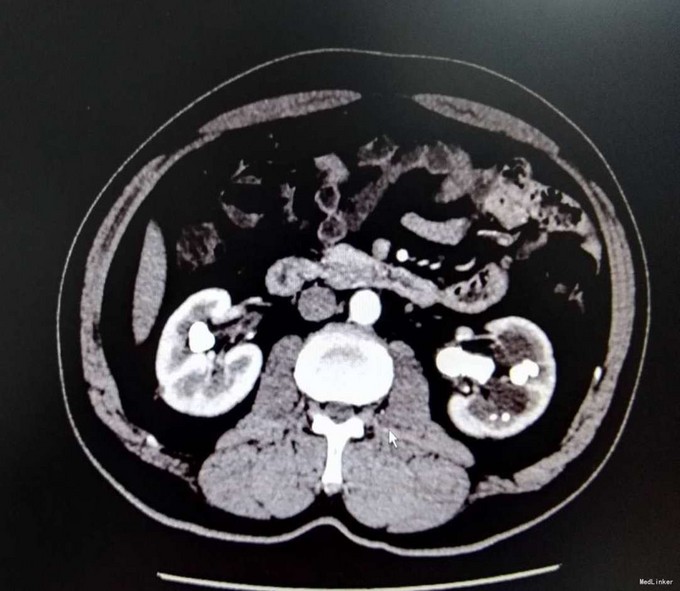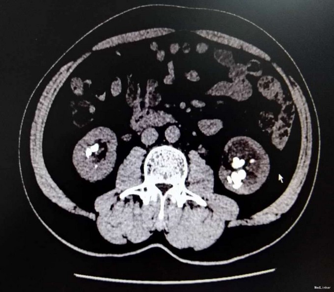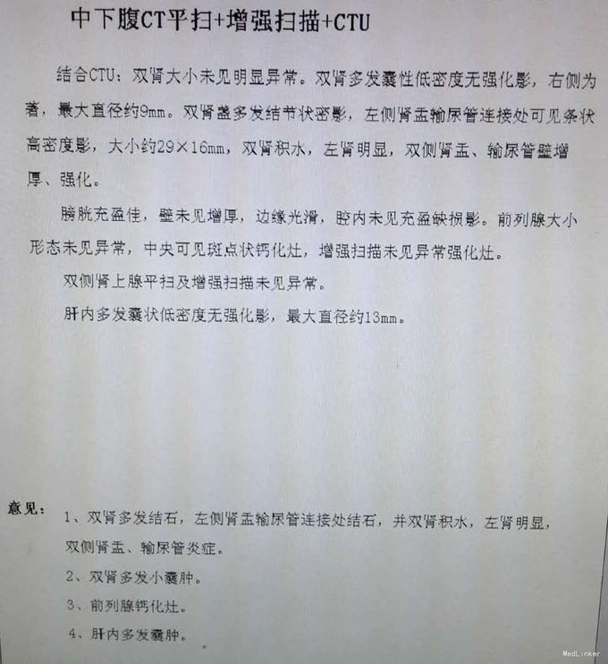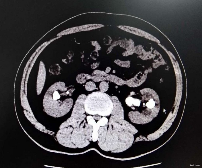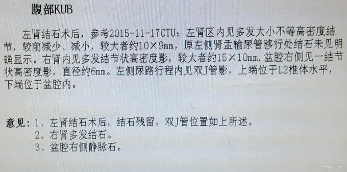 3、查体:未见明显阳性体征 4、辅助检查:外院平片:双肾多发结石;我院CTU:双肾多发结石,左侧肾盂输尿管连接处结石,并双肾积水,左肾明显,双侧肾盂、输尿管炎症。