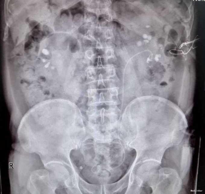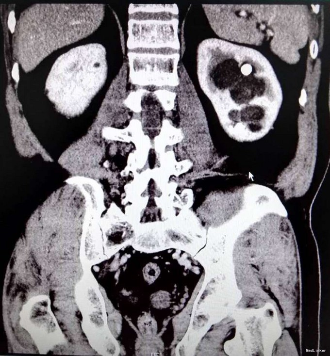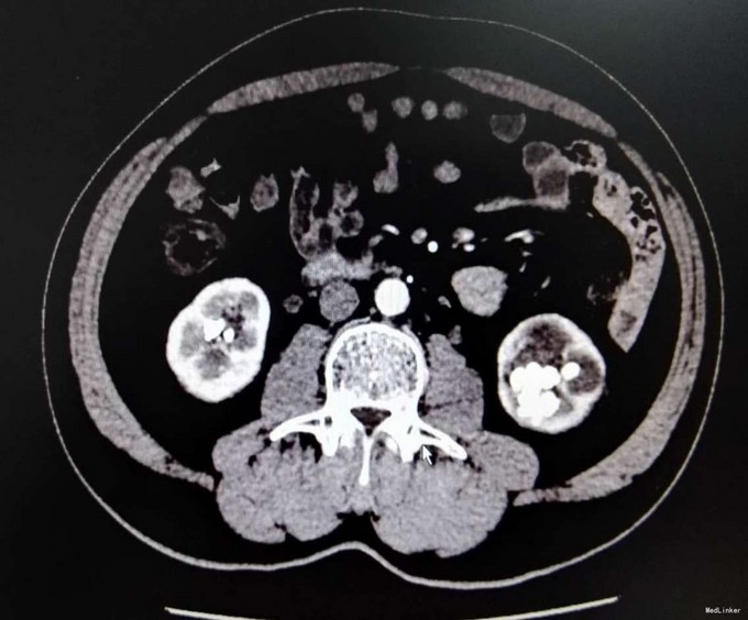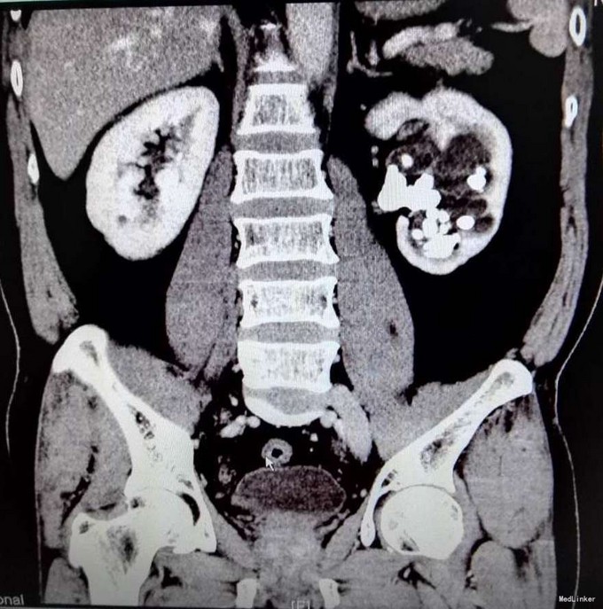 5、诊断:肾结石(双肾多发结石) 6、治疗:入院后完善相关检查,双肾CTU:双肾多发结石,左侧肾盂输尿管连接处结石,并双肾积水,左肾明显,双侧肾盂、输尿管炎症。排除手术禁忌症后行左侧PCNL术,术后恢复良好,拔出肾造瘘管后,先出院休息,2周后返院进一步治疗